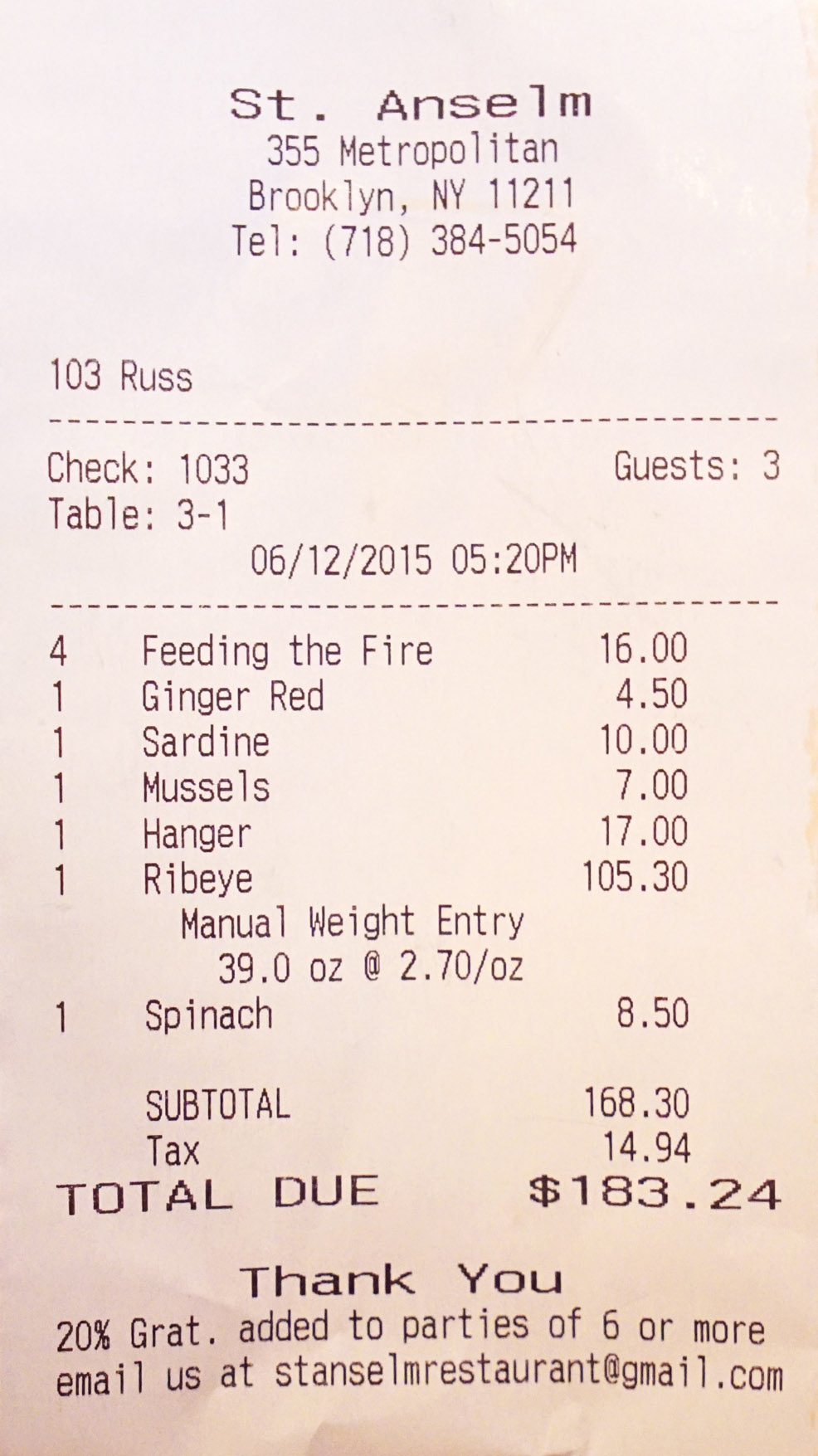 The apps and the hanger are nicely priced, but the rib eye is a bit overpriced in comparison to the rest of the menu. At $2.70/oz, that comes out to midtown prices or higher. Anyway here’s the full bill. As you can see the other items all seemed pretty reasonable.