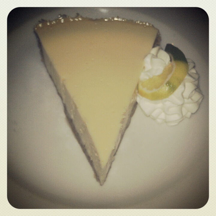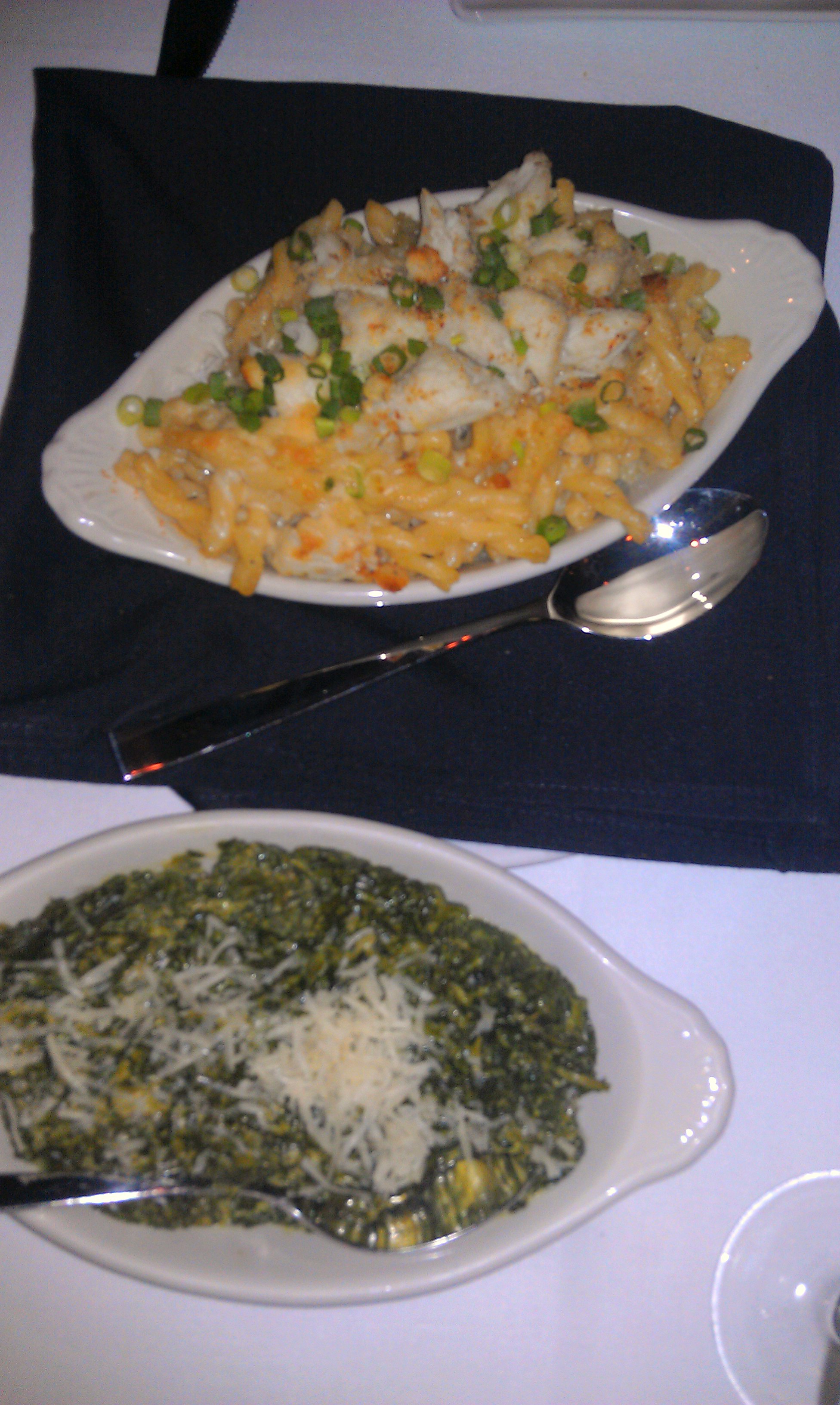 We started with the oysters. They were good, and came with a nice cocktail sauce, but there was no horseradish served with them; instead I got a large hair on my plate, and some of the oysters were still connected to the shell. We also had the blackened scallops. They were overpriced but cooked well. However they were accompanied by a mediocre-at-best mango salsa that reminded us of something we’d have at Applebees. Bastards. My wife had the shellfish trio app for her entree (half of a small lobster tail, two shrimp, and some lump crab meat). It was decent, but I thought a little skimpy for $29. The lobster tail was certainly not the Maine varietal based on its “extra jumbo shrimp” sizing. For sides we had creamed spinach, which tasted like frozen chopped spinach to me, with a touch of cream and some shaved Parmesan on top. Bland. We also tried the crab meat mac and cheese. This was better, but would have been great if the crab meat was mixed into the dish instead of just put on top, if they put more bread crumbs on top, and if they added salt or a bit more cheese to it. In other words, it too was somewhat of a disappointment. For dessert we had key lime pie. No complaints there; it was pretty good.