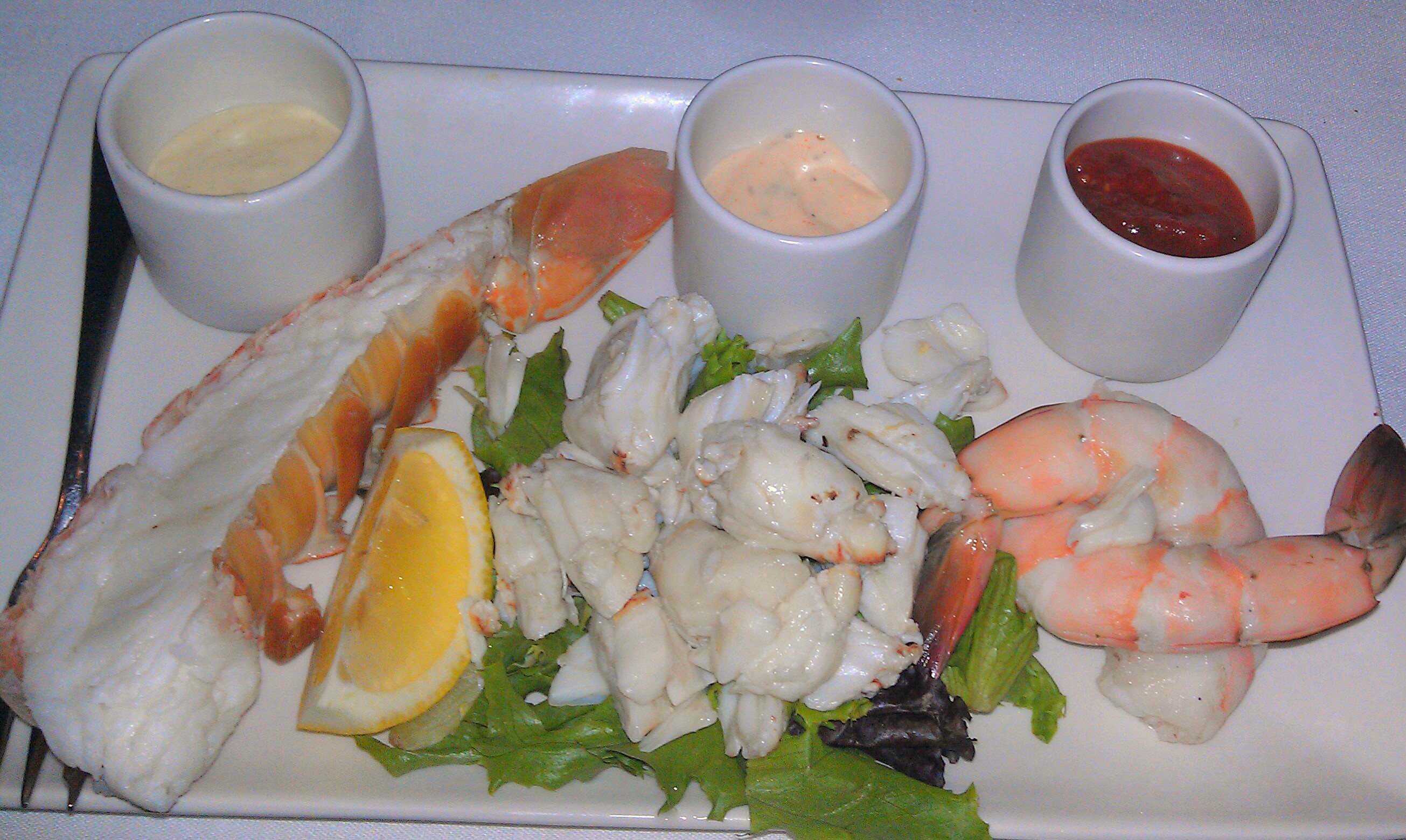 A good amount of seafood graces the menu here. For apps they have lobster bisque, blackened scallops, shrimp cocktail, BBQ shrimp, seared tuna, lump crab meat, fried calamari, a shellfish trio, and oysters. A solid showing. On the entree menu they offer a fish of the day (prepared one of several ways), seared scallops, crab cakes, and lobster tails. Point off for not having a full lobster on the menu, and two points off for the lackluster performance on the shellfish trio app (pictured below).