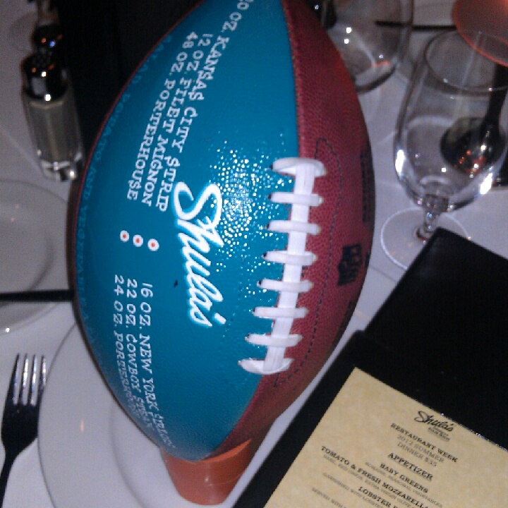 The service here was odd. We made a reservation for 5:30. The restaurant was pretty much empty, yet we were seated way in the back on a very small table for two. We were also approached twice regarding what kind of water we wanted. The table cloth on my side of the table was either stained or dirty, as I mentioned my oyster plate had hair instead of horseradish, and there was just way too much shit on the ridiculously small table when we were seated. Here’s a list: Four empty wine glasses (two for water, two for wine), my wife’s wine glass from the bar, my martini glass, the Shula football (which has the signature steaks listed on one portion of the pigskin – see pic below – an interesting touch but not needed), salt & pepper shakers, two menus, two restaurant week menus (which my wife was not permitted to order from since we were using a 15% off coupon via Savored), a book of wines by the bottle, a candle, silverware, napkins, and the flatware. All of this remained with us until the waiter took our order, and even after that we had to move the two extra wine glasses to a nearby empty table ourselves. I was barely able to see my wife’s face for 15 minutes after being seated. Just a reminder: the table was SMALL – REALLY FUCKIN’ SMALL. I’m talking 7 sq. ft. at maximum: seats for two at McDonald’s are bigger than this shit. Other than that the bread was good: a pre-sliced loaf of warm, crispy, fresh sourdough.