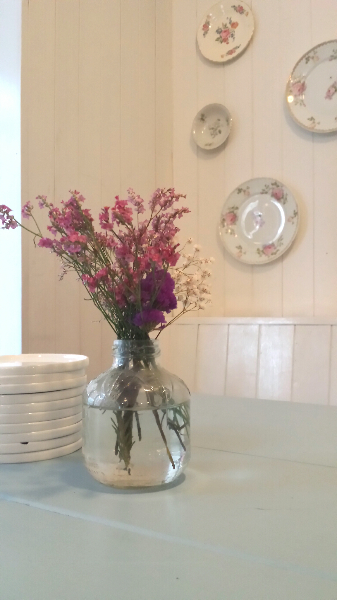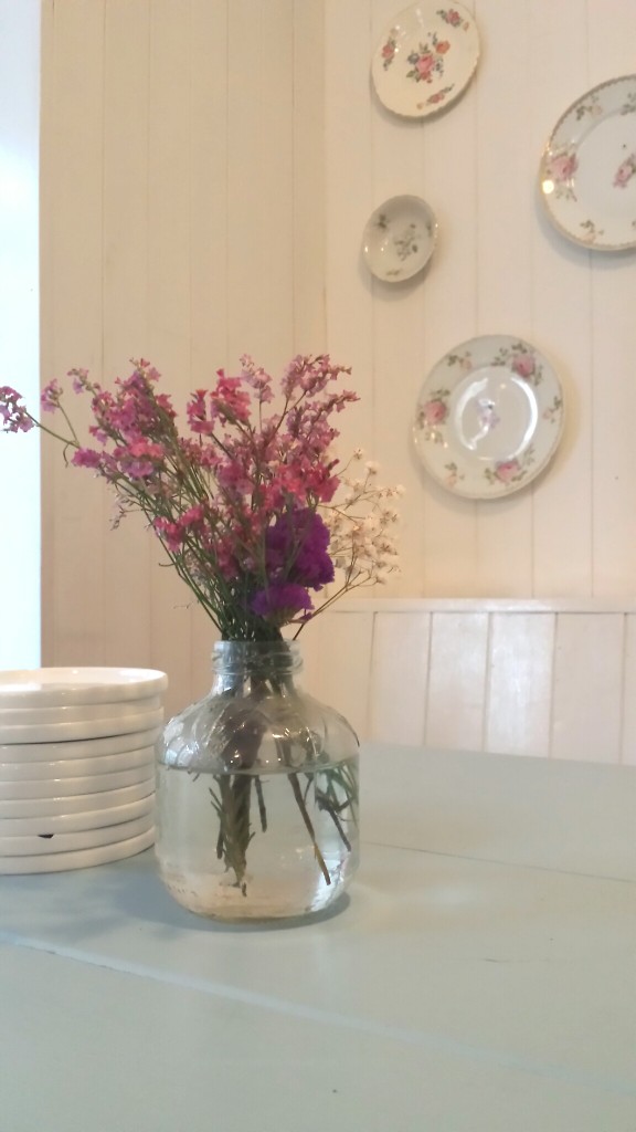 The decor is really nice: washed blue with dark brown and white. Very “modern nuptials” in scheme, with a bit of Cape Cod accents.