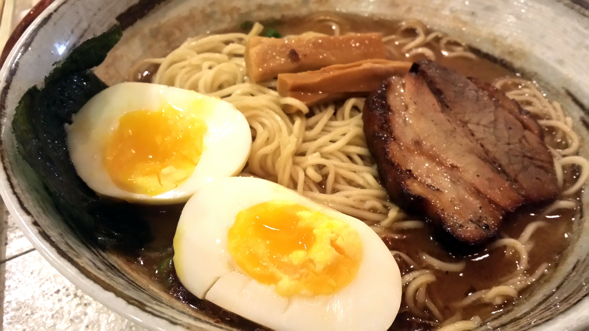 But… I needed a little something extra, because deep down I’m still a fat guy, despite losing over 40lbs since January 1. So we went to nearby Bassanova with our friend from the party, Jay, who runs the Dishelin Guide website. Check out his page – pretty damn good idea for a food blog! Ramen is a great way to cap off any night. This particular variety was truffle wadashi tondaku ramen (pork broth).
