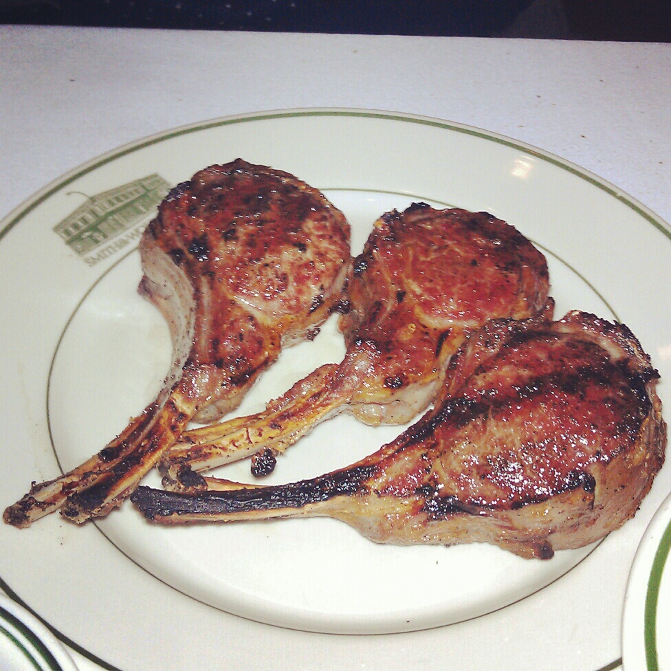 Our waiter didn’t read us any specials, so I was assuming there were none… until we overheard another waiter take a surf & turf order. I have a feeling my wife might have ordered that had we known about it. It wasn’t on the menu if it was a special – I’ll chalk that up to a service mishap. For other meats, they had braised short rib, lamb chops (which my wife ordered), roasted veal chops, and lemon pepper chicken. The lamb chops were thick and juicy, and cooked nicely – not too gamy. They came with an utterly horrific mint jelly (on the side, thank God), which tasted like melted mint gumdrops – those big, granulated sugar covered ones that you get from a crystal candy dish at your dead grandmother’s house. Mildly reminiscent of tooth paste. Fuck that shit.