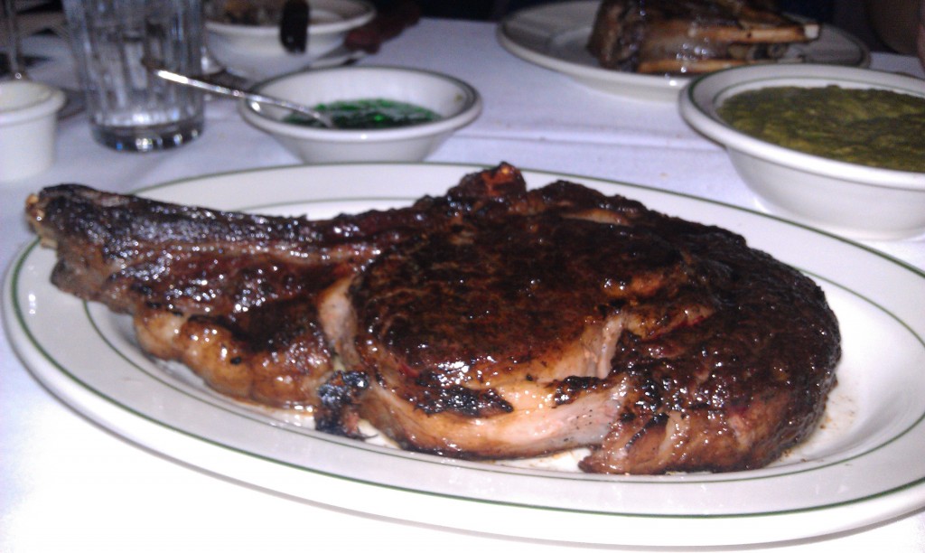 To start, I had the colossal Florida stone crab, which to my dismay was just a claw and not a full crab. It was absolutely delicious though. My wife had the famous split pea soup, which was very smooth and tasty, but ultimately nothing to rave about. On the side we had creamed spinach. I had heard good things about it here, but I wasn’t impressed. I prefer a leafier creamed spinach in general, but I am not opposed to the pureed type. Here it was pureed, but I thought it lacked punch. It was nice when you slathered it on your meat and took a combo bite though. For dessert we shared a disappointing slice of the bourbon pecan pie. The nutty top part was nice, but the inside was a little too gelatinous and fake tasting. It just didn’t compare to the walnut pecan pie at Sparks.