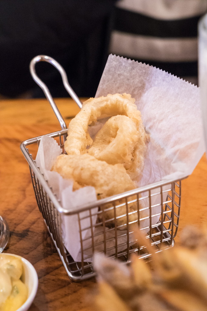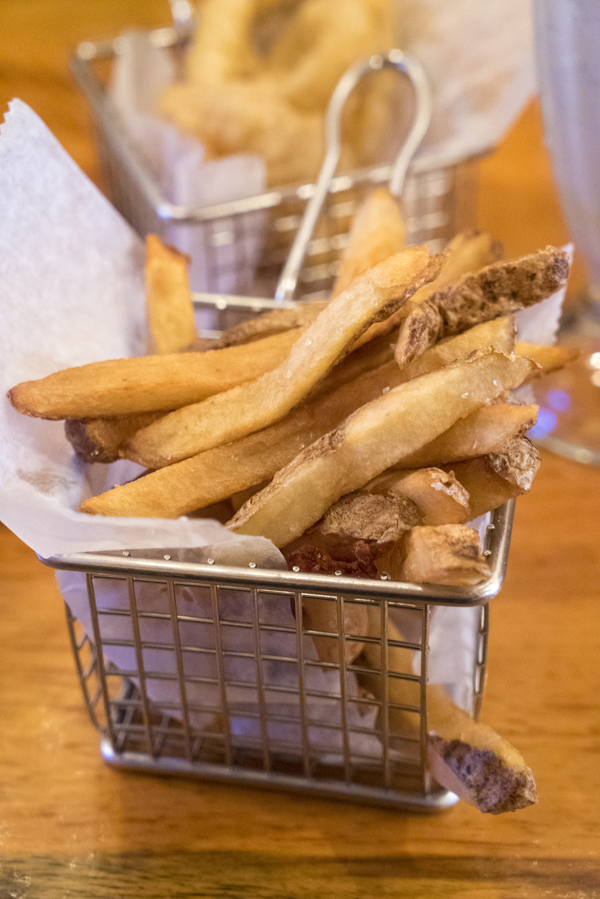 On the side we had an order of onion rings and an order of fries. Both were a little bit limp or soggy, but nevertheless tasted good because they were well seasoned.