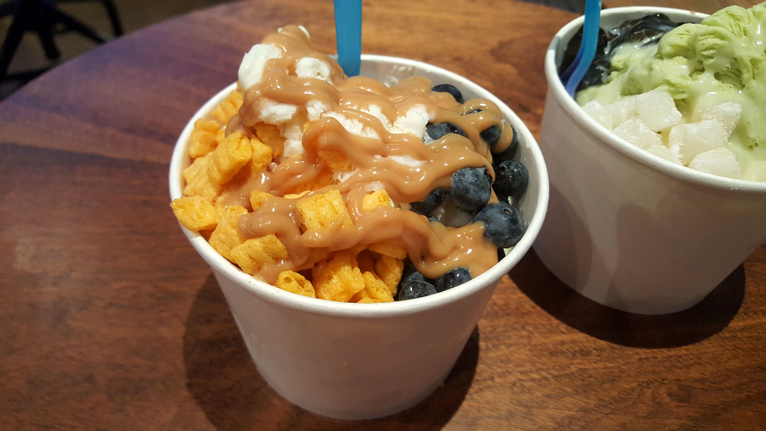 I went with “original,” which was sweet milk cream (shaved), topped with Cap’n Crunch, blueberries and peanut butter sauce.