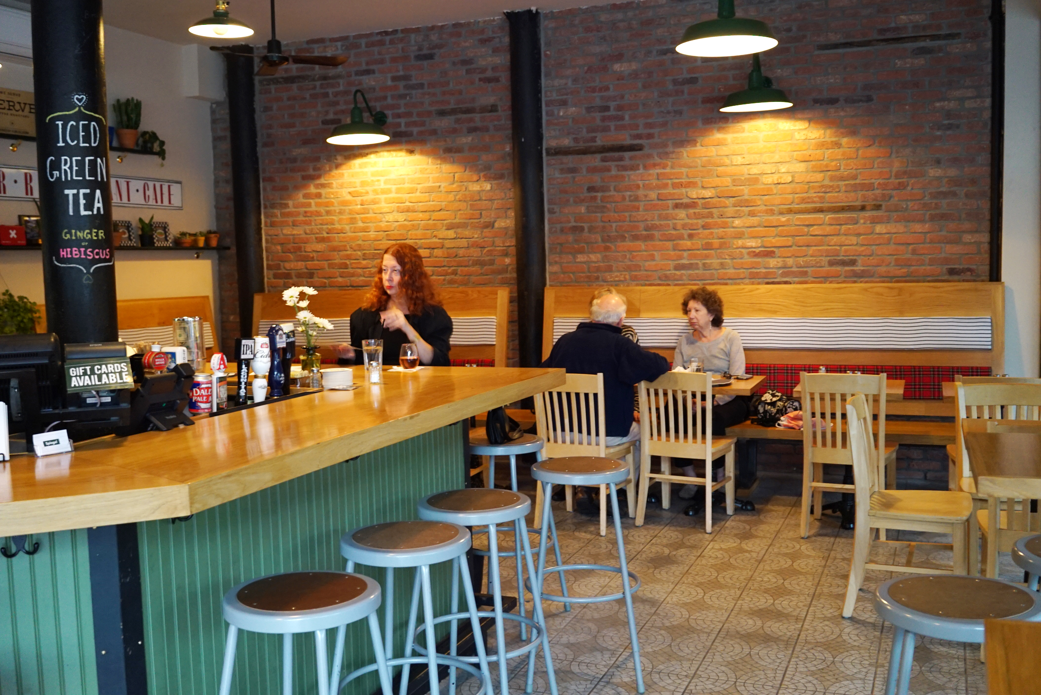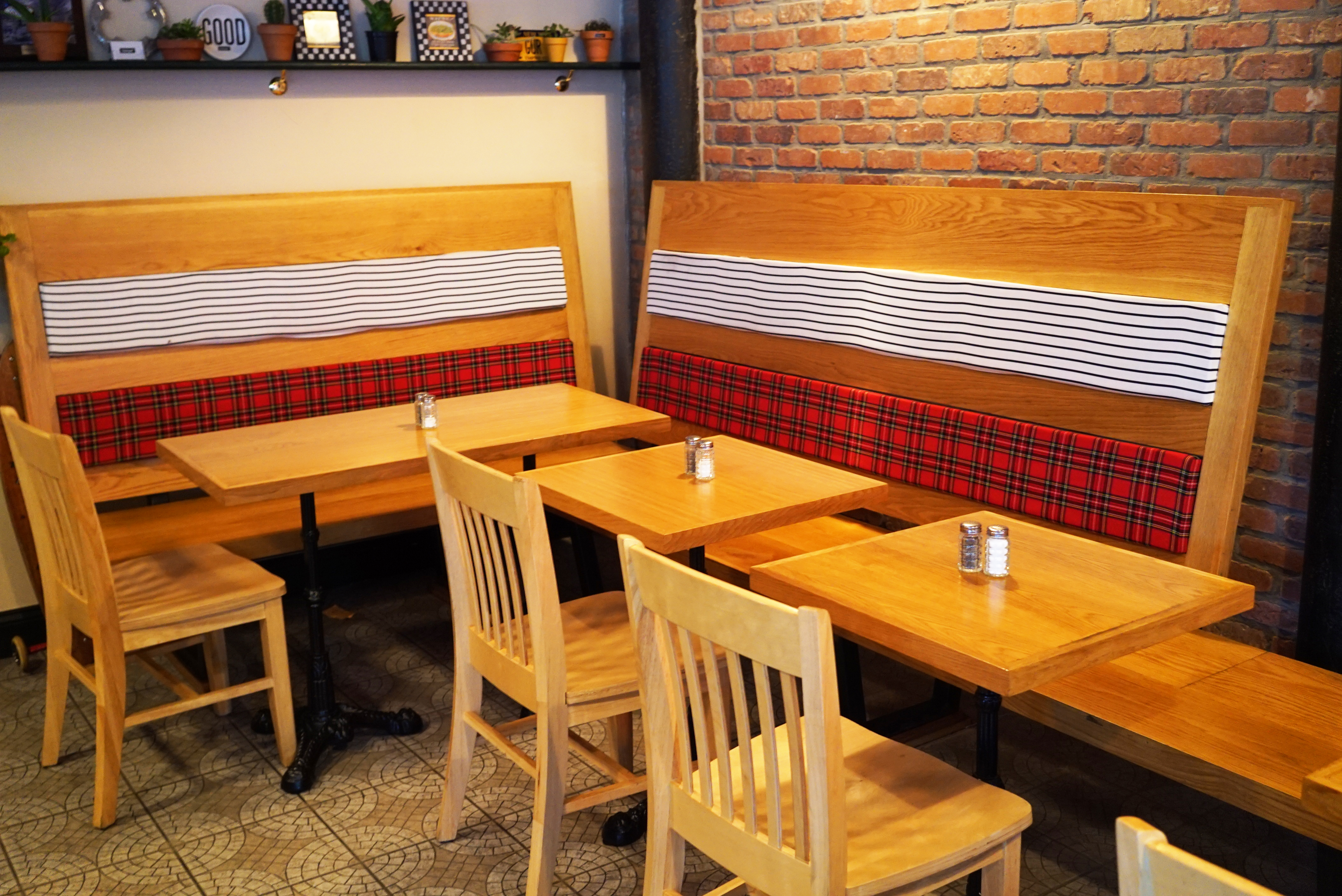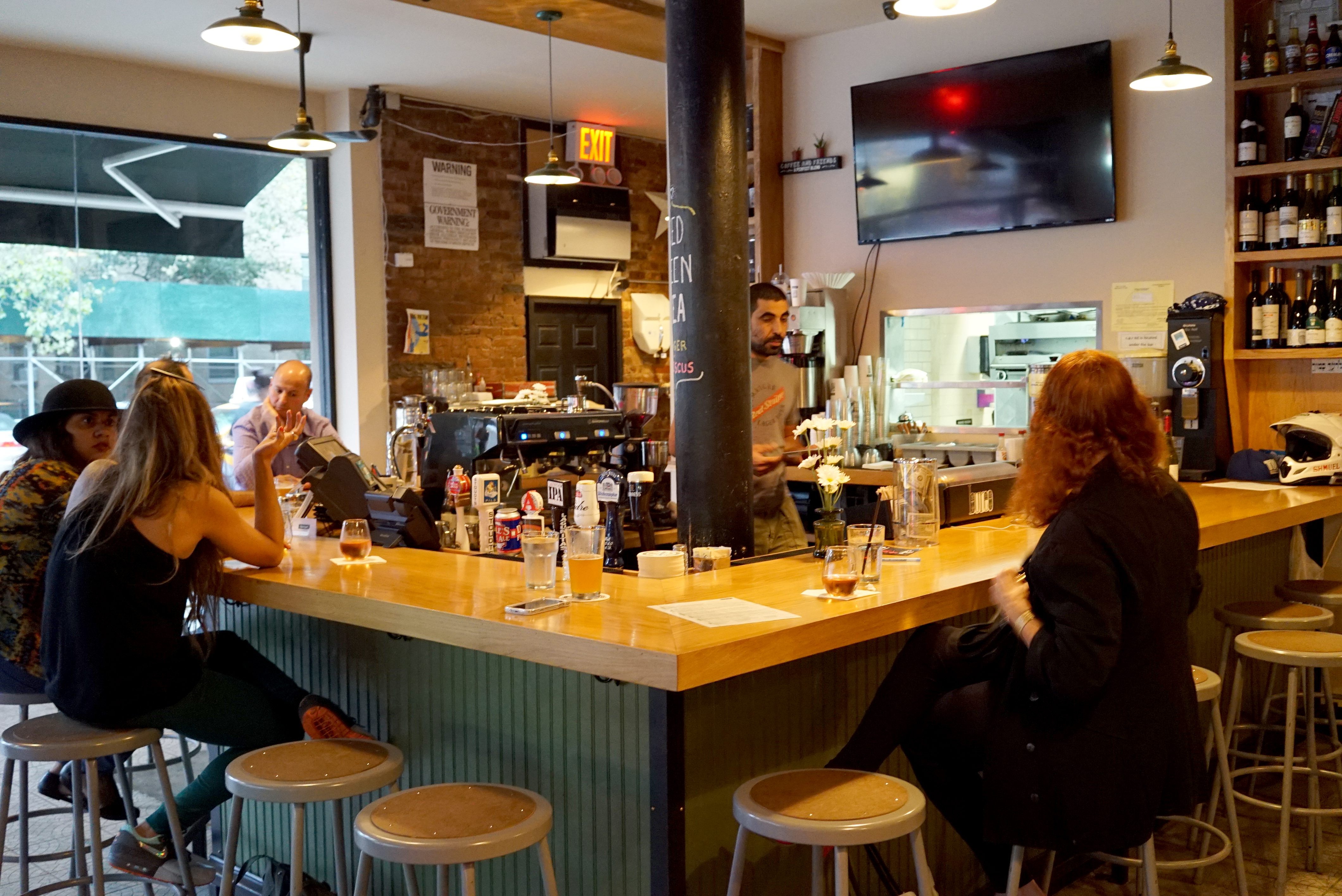 The ambiance is like a cafe, with a nice, large, custom U-shaped bar, oak and fabric seating, decorative brick walls, massive windows and tiled floors. An outdoor searing area that wraps around from avenue to street is set to open in April of 2015 as well.