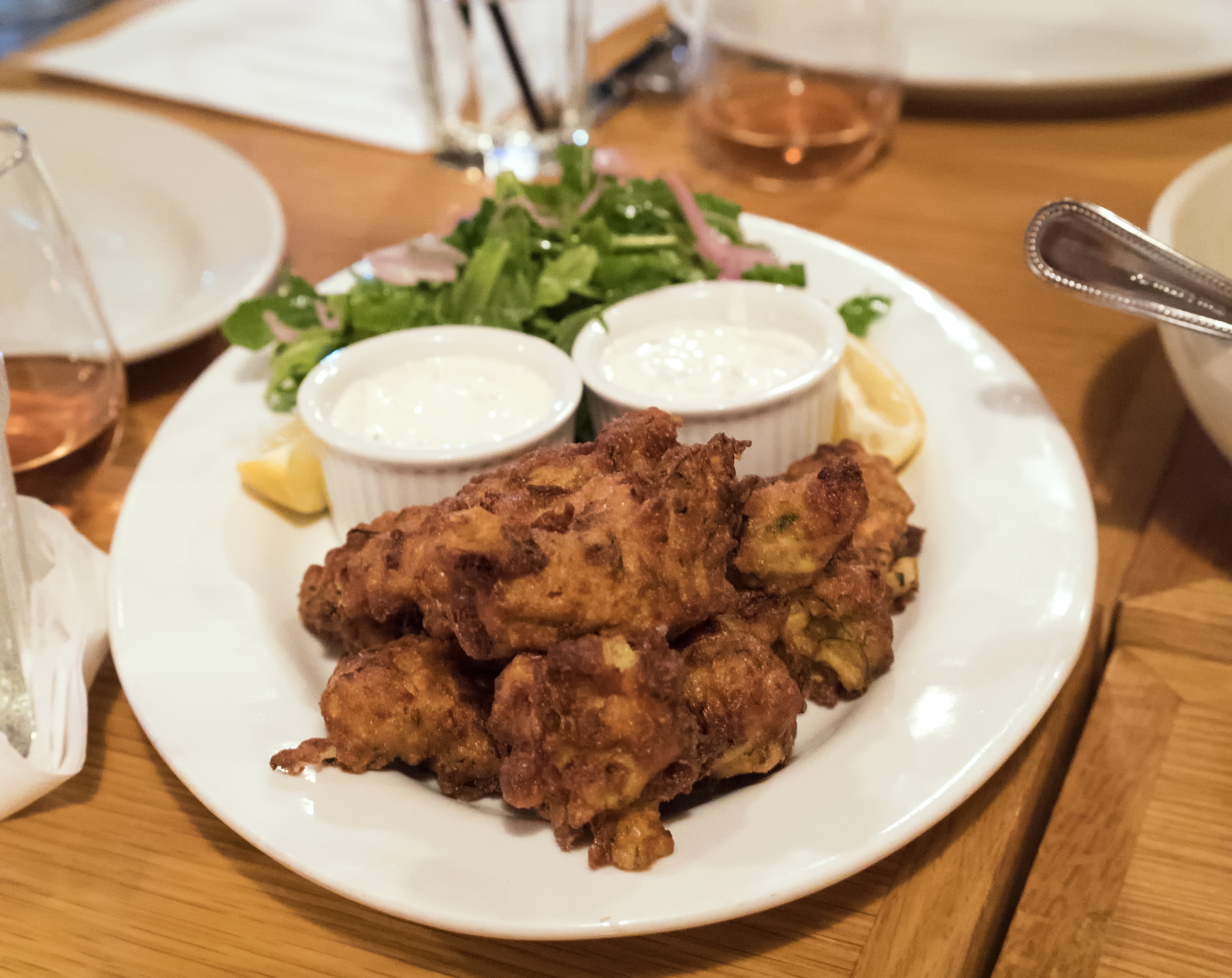 The zucchini fritters were nice and crispy outside, and flavorful inside. They came with a yogurt type sauce and a small side of nicely dressed arugula.