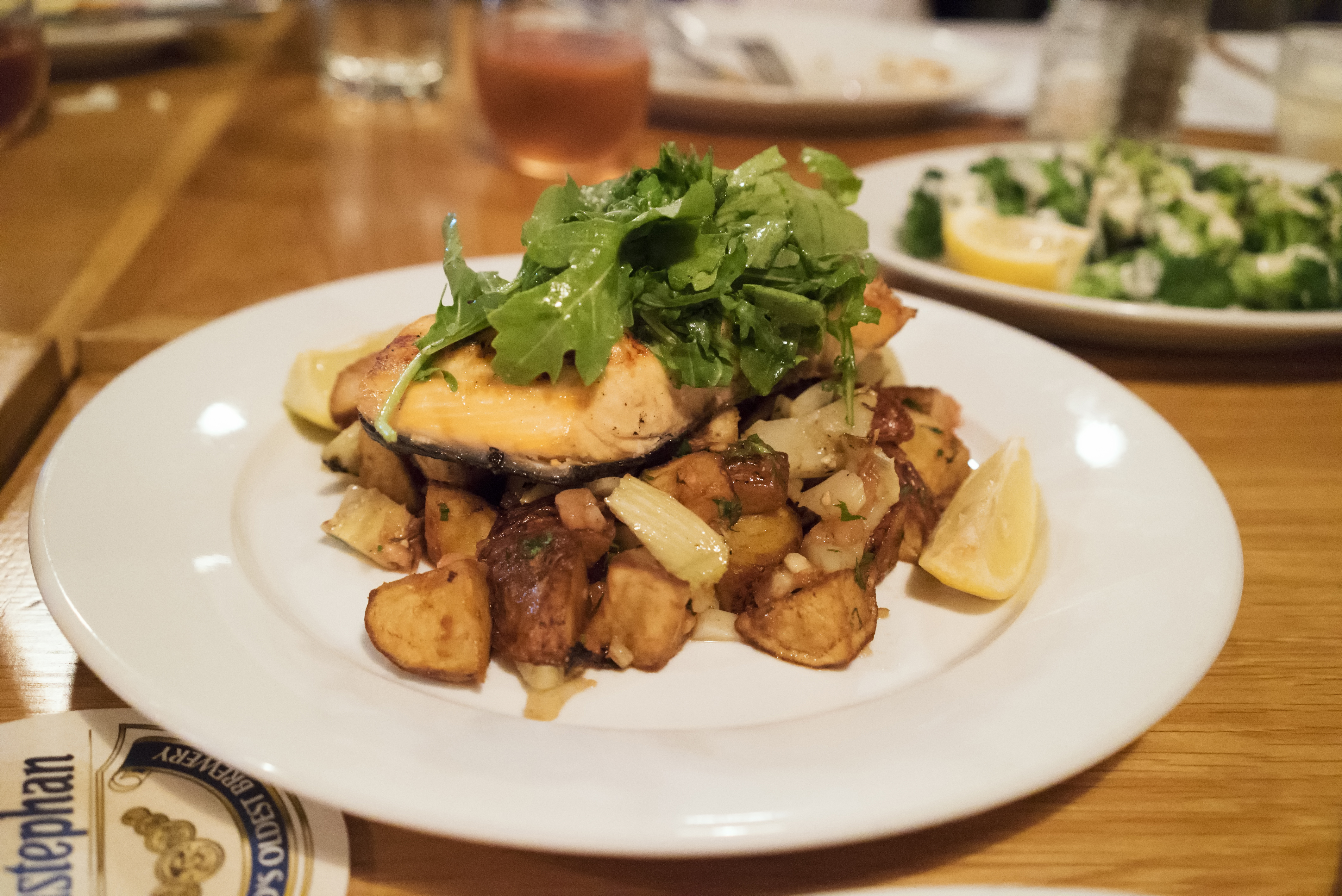 The salmon was perfect. Juicy, tender, brimming with mild flavor. It came on a bed of roasted, chopped potatoes.