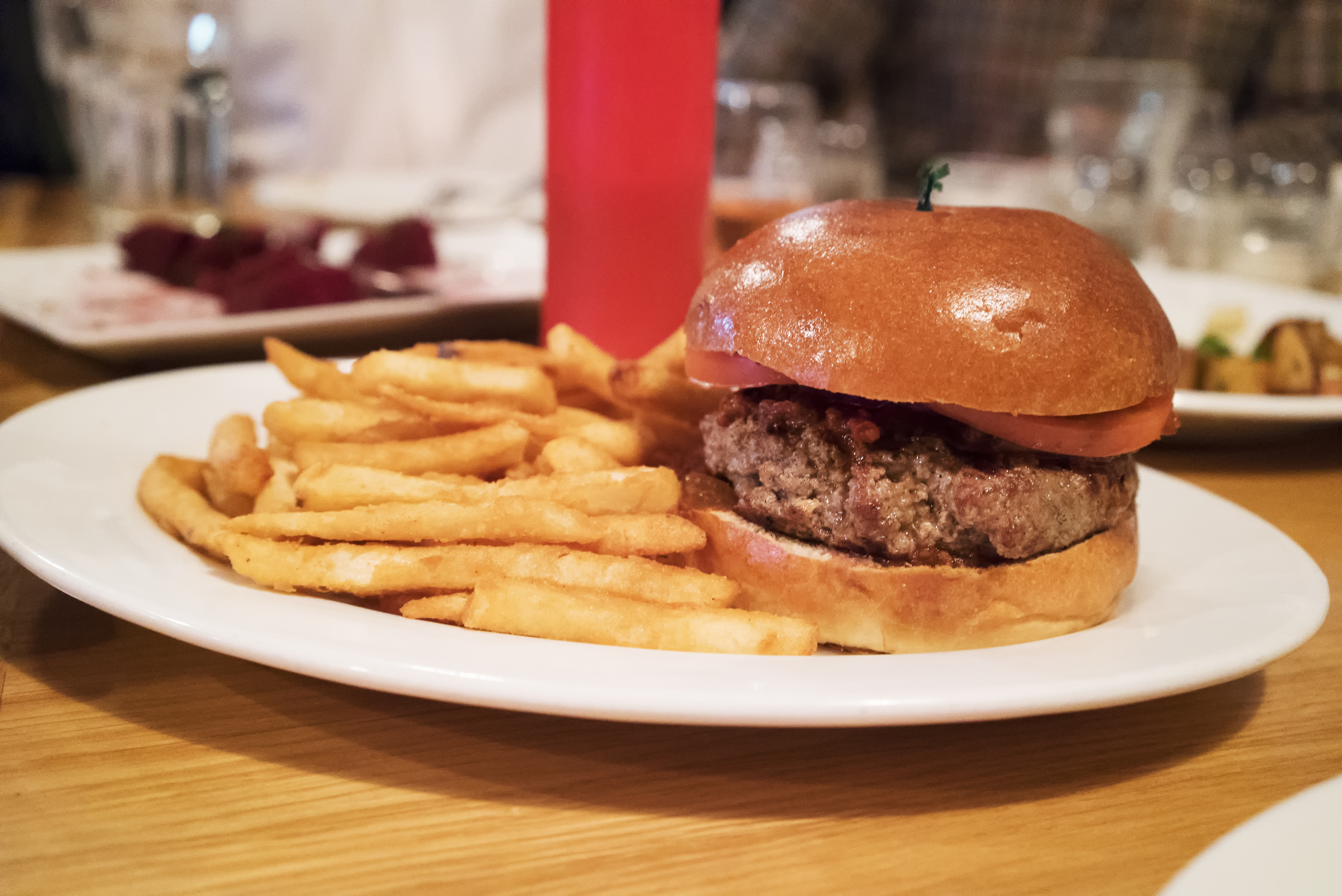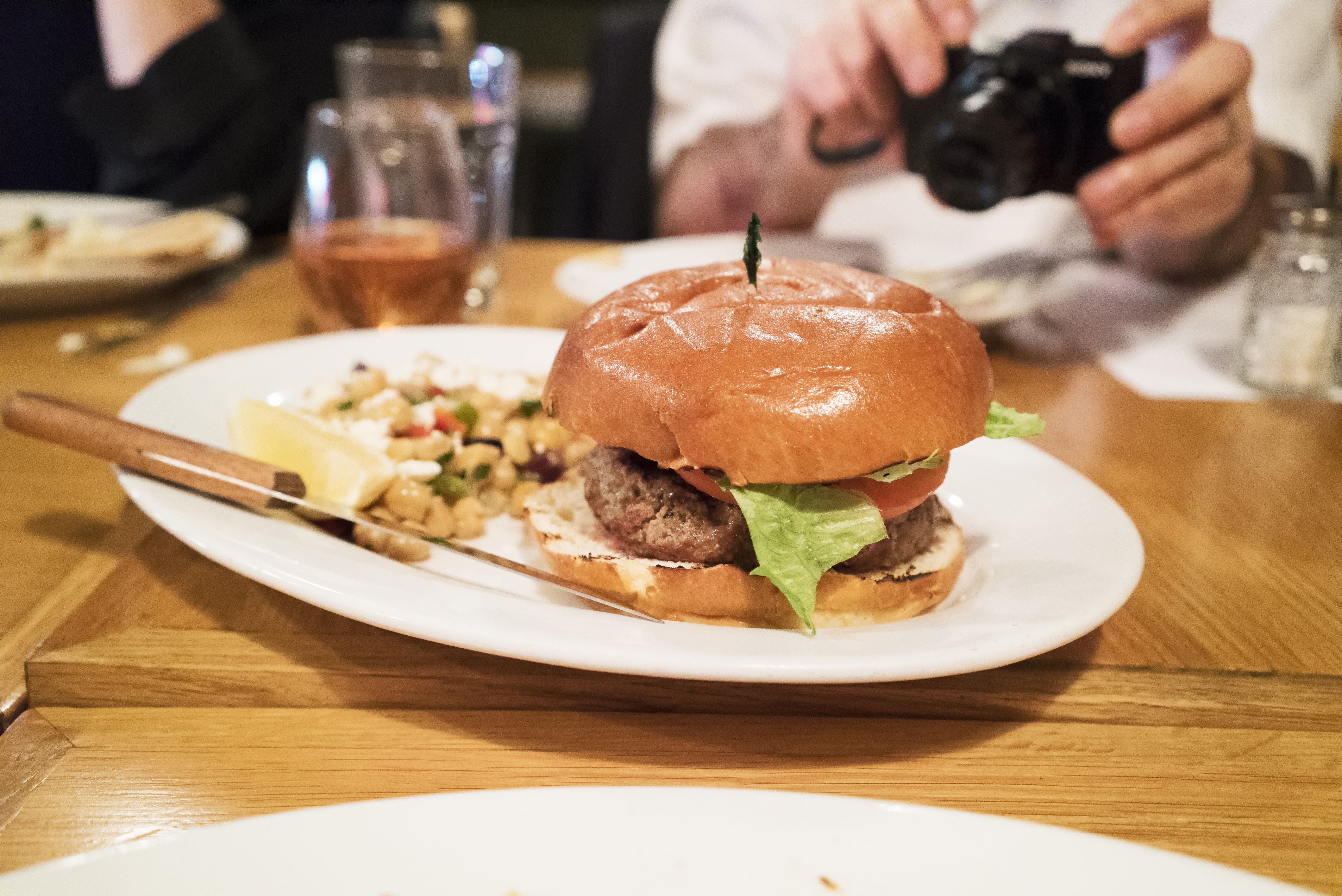 The other burger was the classic. Liberally seasoned beef, lettuce, onion and tomato. I prefer this to the Kipling. The only issues for me were that both burgers were a bit over cooked, and I think this classic burger could have benefitted from some cheese. This plate came with a small chic pea salad which was herby and refreshing, and topped with a little bit of crumbled feta.