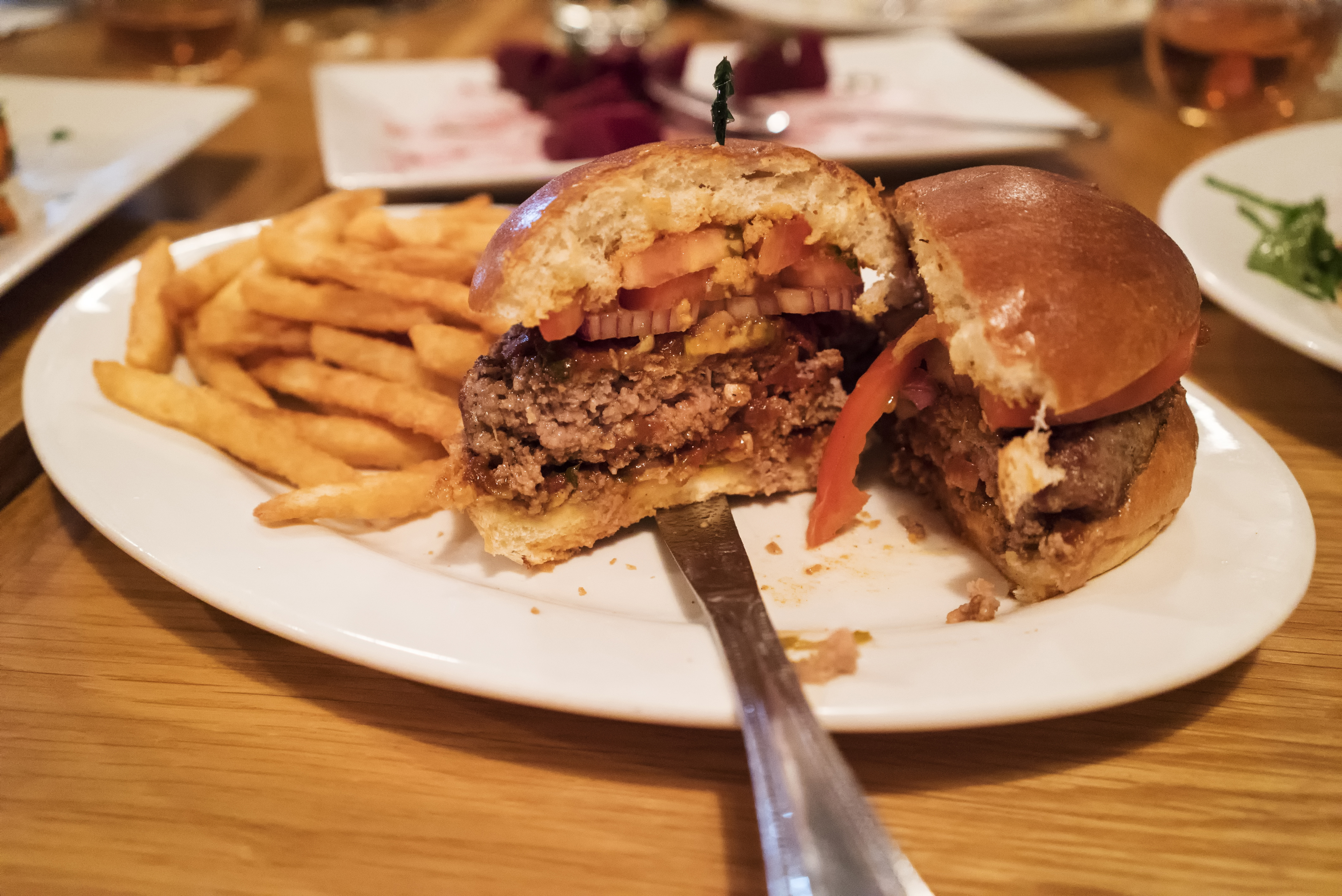 And then came a pair of burgers, which were prepared specially for me, the meat man (the other dishes were mostly just fish and veg). The first one is called “The Kipling,” named after a patron who always orders it. It has a topping of the same tomato and eggplant sauce from the baked feta dish. To me, it was very reminiscent of a Sloppy Joe in terms of flavor profile. The burger was solid and held together, not like the mushy chopped meat in a Sloppy Joe. I think what took me to that “Sloppy Joe” place was the tomato flavor.  On the other side of things, the french fries were some of the best I’ve ever had. They were absolutely perfect. There was a crisp batter texture to the outside, but the inside was soft and flavorful like mashed potatoes.