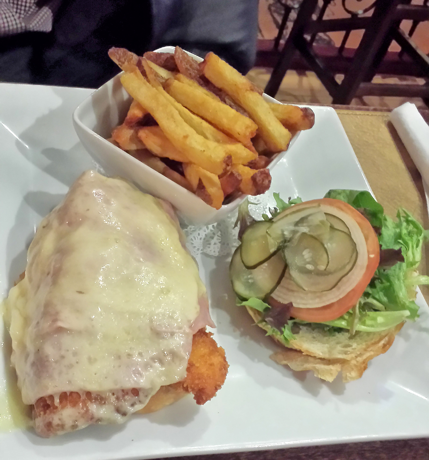 My buddy got a “chicken burger,” which was essentially some chicken breast pounded flat and breaded/fried, then topped with ham and swiss, and smeared with some thousand island dressing.