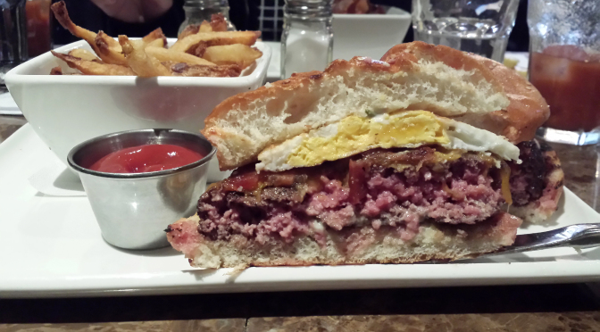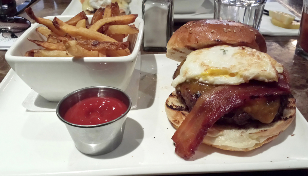 The breakfast burger turned out to be amazing. Really tasty maple bacon, cheddar cheese, and a fried egg. Wonderful.
