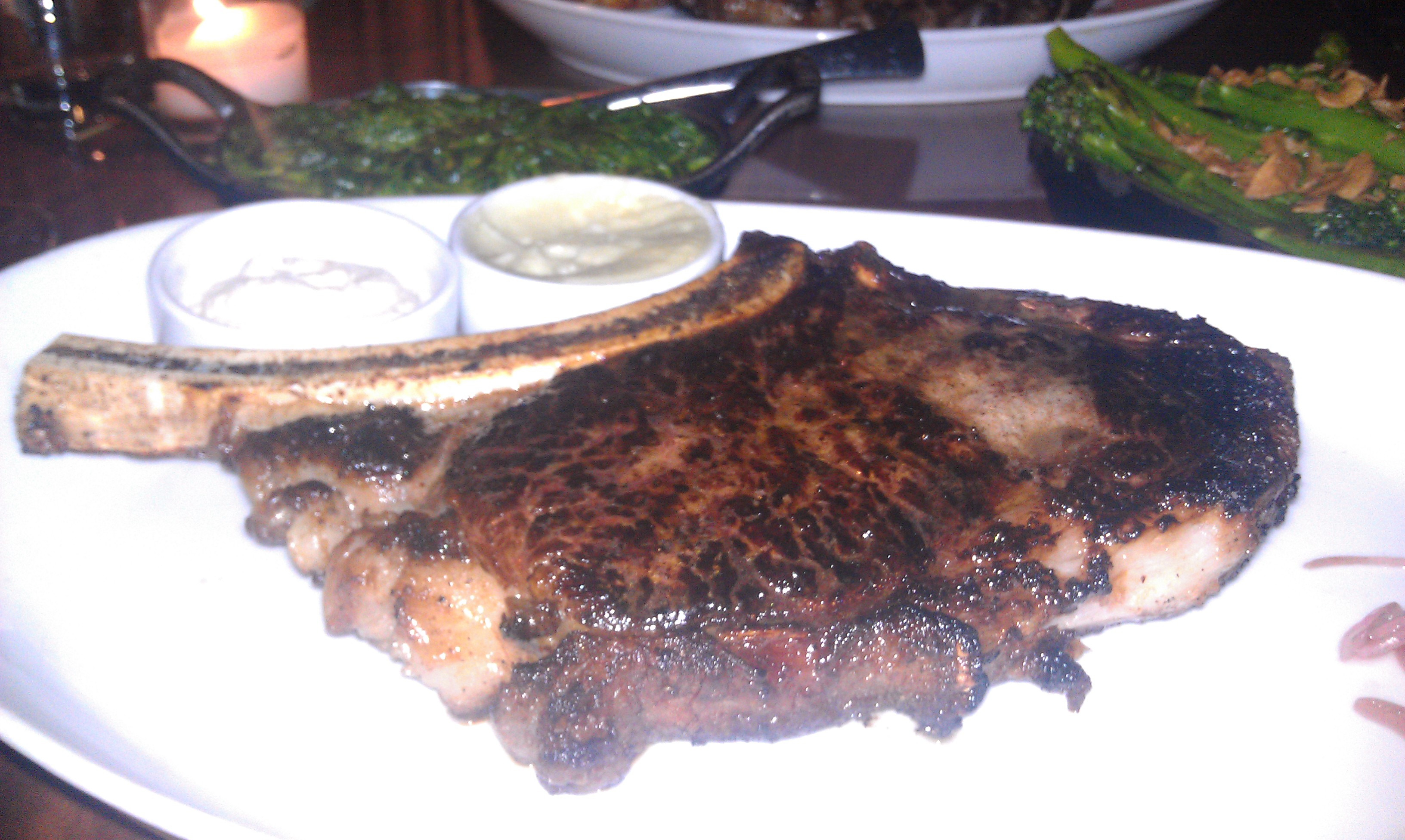 To start, we had a dozen oysters, which consisted of half east coasters and half west coasters. Both were mild, creamy, crisp, cold and delicious. They came with a really amazing light, airy horseradish cream. For sides we had sauteed broccolini and creamed spinach, of course. The spinach was low on cream, which I like. Very tasty, though a bit salty. The broccolini was perfect; firm but juicy, with a slight char, and accompanied by some crisp fried onions. For dessert we had the bag-o-donuts (Ayyyyyyyyyy… Fuhgettaboutit!!! You fuckin’ FUCK!). They were MINT! They were filled with a nice cream sauce, and came with jelly dip. COME ON! Perfectly fried.