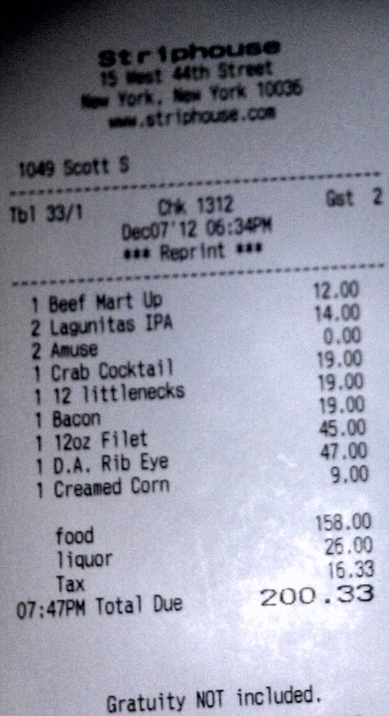 The bill from my second outing is below. Really fucked up problem here – my buddy who did the math on the tip messed up and we under-tipped at around 15% when we meant to give more like 25%. I vow to make it up to Chris, our waiter, who did a freaking fantastic job at our table. I think we were about $60 short of what we meant to give. Hilarious part about this: we had an accountant at the table.