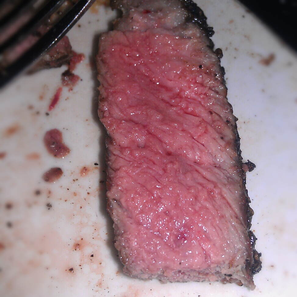 I’ve been to the other Strip House downtown several times, and I’ve pretty much tried everything on the menu at this point. With any new place, though, I always have to go back to the standard order for a review: the dry aged bone-in rib eye. It was fucking insane. Nice and savory, juicy as all fuck, and perfectly cooked from end to end. There was not one speck of gristle or fat left on my plate. I ate every glorious bite. Look – I went at it so fast that I only managed to remember to take a pic of it at the last minute, when I had one slice left. Note the perfection of color and the juicy reflection in the flash. My buddy had the filet, ordered medium rare. It, too, was perfectly cooked, though mine packed a hell of a lot more flavor (we both agreed).