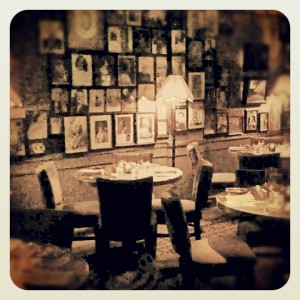 When you walk in, you feel like you just entered a movie set, or a place ripped right out of the old days. The walls are a deep wall-papered and patterned red. It is cozy and warm, but elegant. The filigree wallpaper even matches the cloth napkins at the table, and framed portraits of old timey nekkit ladies grace the walls, covering nearly every square inch with history. The cushions on the wall seats are a pillowed red; very art deco. The only thing that seemed out of place was the high-school style speckled large-tile floor. The bathroom was nice and fancy, old fashioned too, but a little small.
