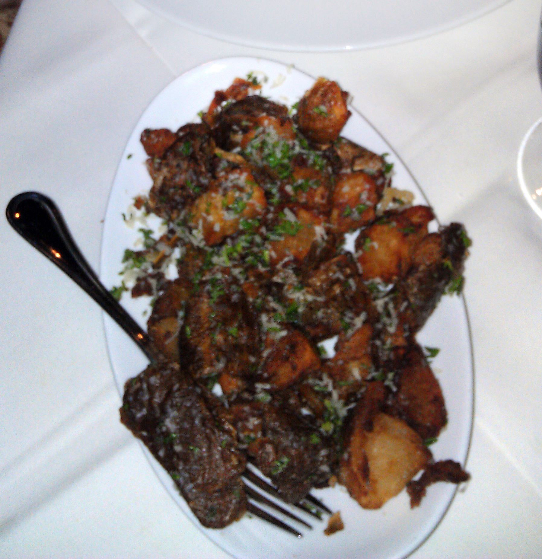 Portion sizes are just right for the steaks. The strip comes in 16oz or 20oz (bone-in) portions; the filet is either 8oz or 12oz; and the ribeye is 20oz (bone-in). The porterhouse for two is 38oz, and the Chateaubriand for two is 24oz. The garnish on the plate was a nice roasted bundle of garlic, within its paper, sealing in all the heat to make it nice and spreadable. I didn’t delve into it too much, but it was a nice touch, and it even had a sprig of rosemary sticking out so it looked like a little pine tree (rosemary) with the roots wrapped (garlic bushel). Speaking of garlic, it seemed to be a common theme on many of the plates. For example, in the crispy goose fat potato dish, garlic was sliced and fried, and placed on top with a little bit of parsley. There was also some minced garlic cooked into the sear on the steak (nice!). The garlic wasn’t overpowering at all; just prevalent. The sides were a bit on the small side in comparison to other places I’ve been, but to be honest there is enough to feed two people on any one dish. The ripped potato app is a fairly large portion, however. See pic below: