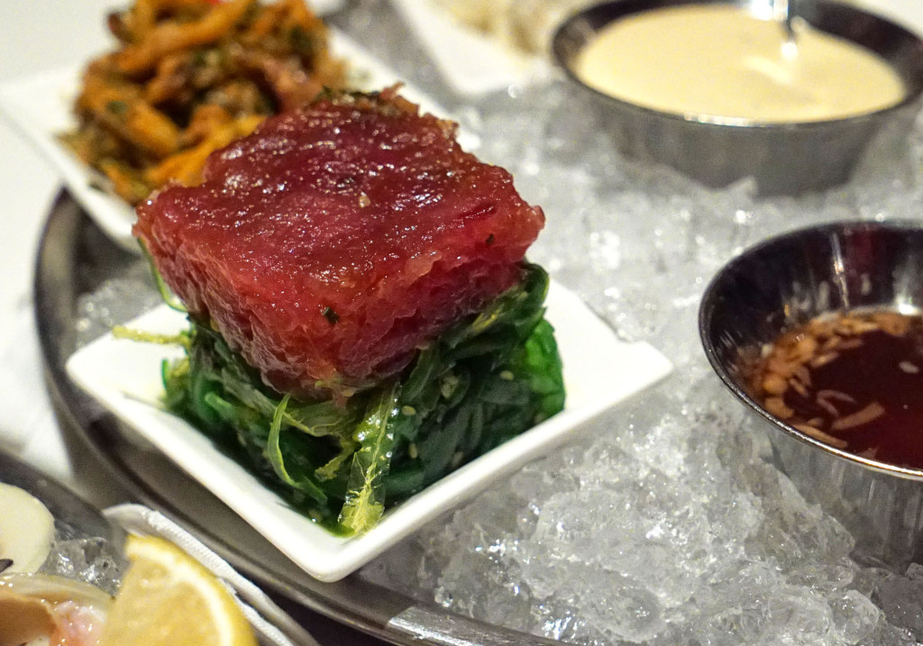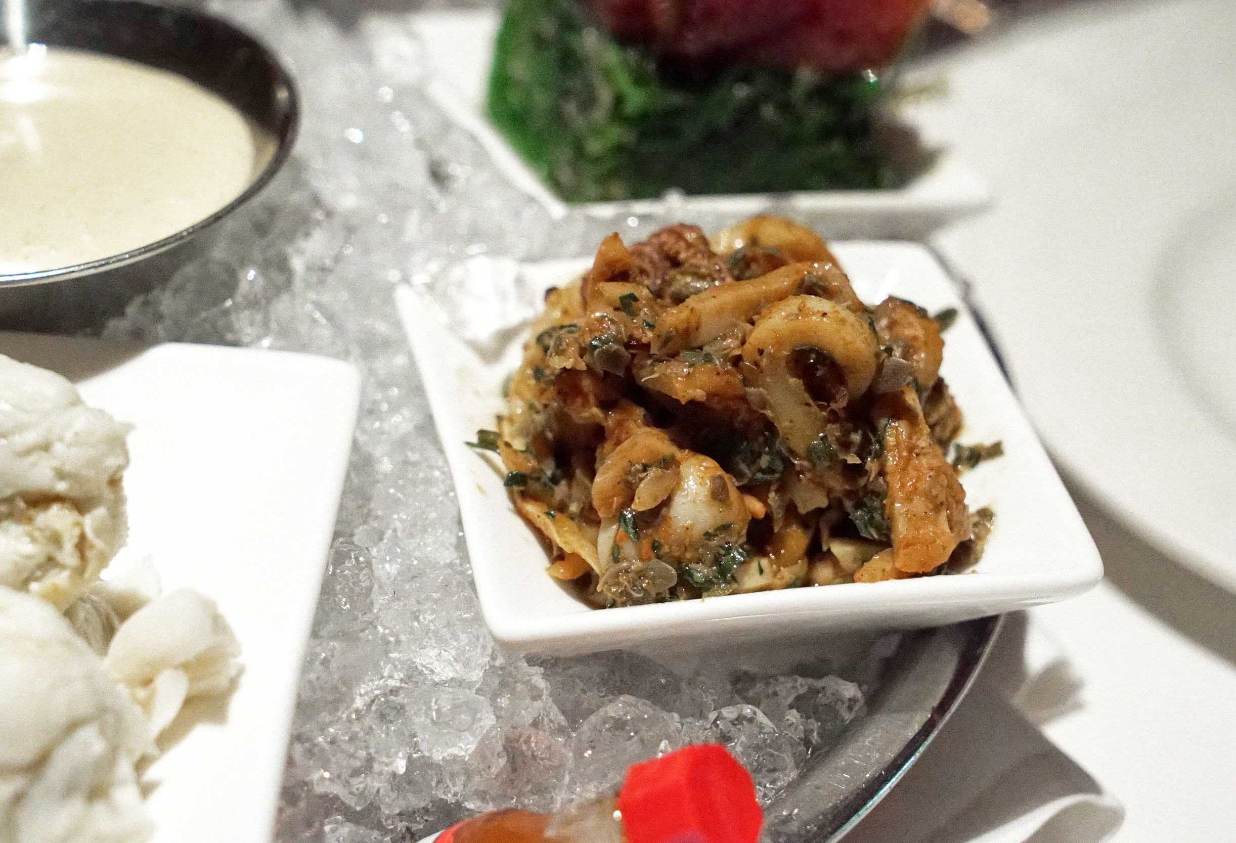 Strip House has a nice seafood selection. Shrimp, crab cakes, scallops, and a seafood plateau for apps (along with lobster bisque); Yellow fin tuna and red snapper were mentioned on the menu online, but in the restaurant they had crispy skin Scottish salmon, and a sea bass entree. Solid change up. They also had Maine lobster (2- and 3-pounders) for entrees (along with a lobster linguine). They had a good selection of oysters and shellfish too, but the real kicker was the seafood plateau. Holy shit, my friends. Here is what was on the saucer of goodness: tuna tartare on a bed of seaweed salad; grilled calamari salad; lump crab meat ceviche; shrimp cocktail; a half lobster; a generous amount of Alaskan king crab legs; east and west coast oysters; and littleneck clams. It seemed never ending, and totally worth the $49 price tag. It came with an array of amazing sauces; a home made cocktail sauce that was creamy and generous with freshly grated horseradish; a cucumber vinegar bath; and of course the steak sauce (not with the plateau), which really was amazing with the seafood rather than the meat. Let’s put it this way: it makes Luger’s sauce look like bottled ape shit.