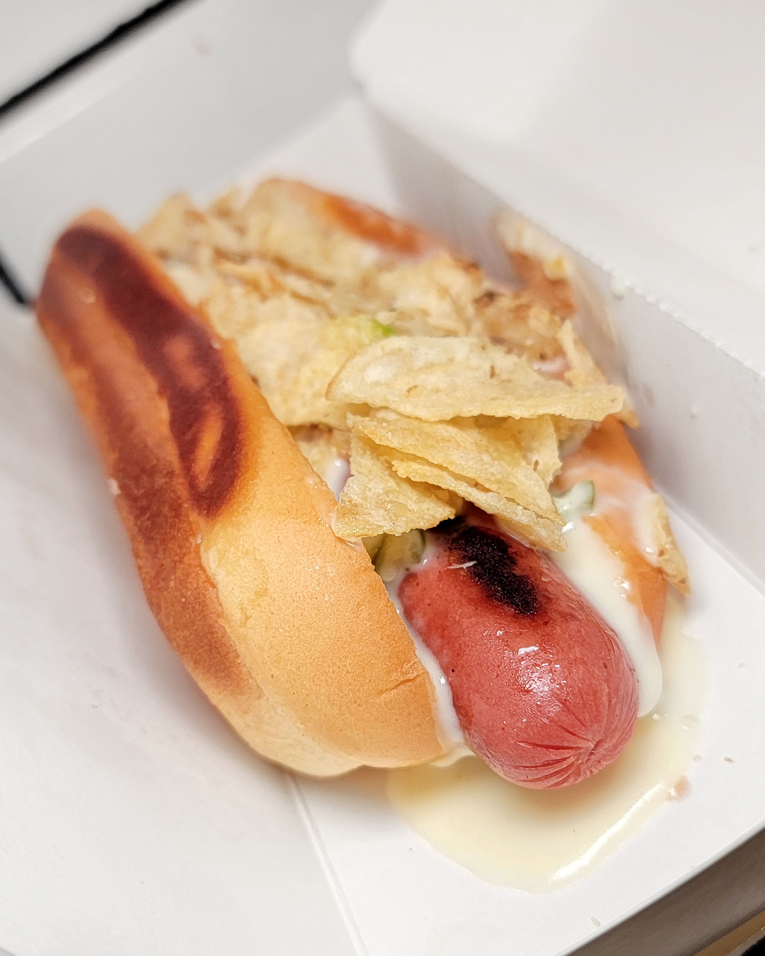The hot dog is pretty great too. It comes covered in melty cheese sauce and potato chips.