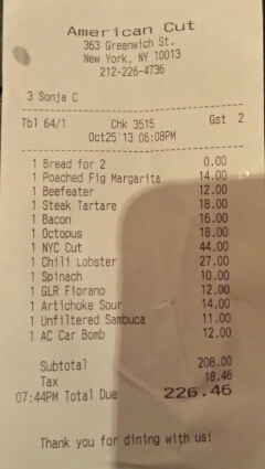 Our bill came to about $75 after tax and tip for one $29 restaurant week lunch with a glass of wine and an order of beef tartare. Not bad, but not awesome considering we weren’t too happy with the skirt steak. Even though the place is pricey, the best value you get is when you order steaks from the full dinner menu and stick to that. My sense is that this score will increase after a second trip with a better steak-eating experience.