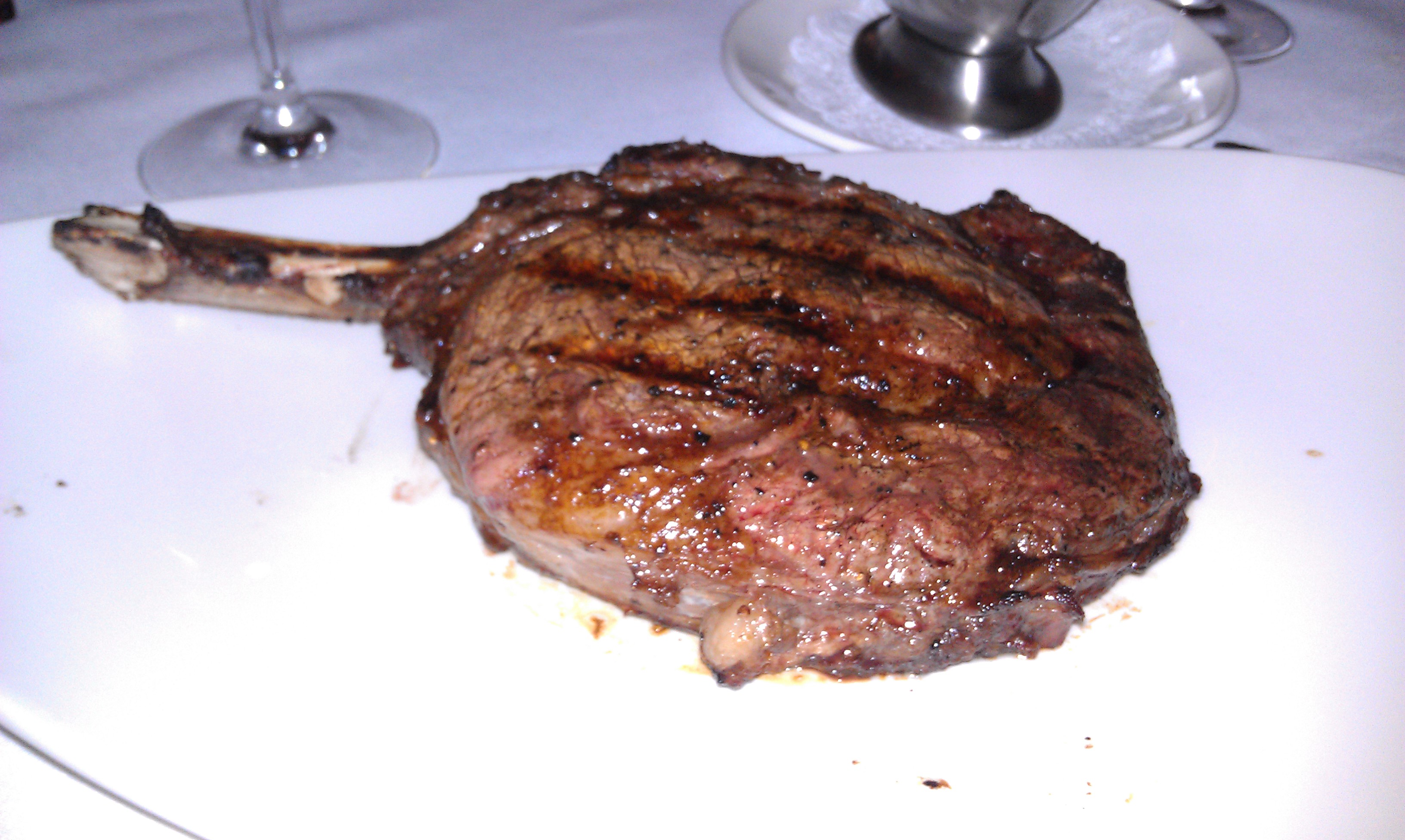 I had the bone-in ribeye. It was nicely cooked and even all the way through, but lacked a little bit of char and crisped edges. Otherwise it was well rested, juicy, and seasoned appropriately. The others leveled similar criticism about the meat, but I must say despite that mishap my steak was really fucking tasty, so I am only deducting two points. One of my buddies almost sprouted labia and ordered lamb chops, but he was quickly set in line and went with the ribeye as well. I wonder if he would have been happier with the lamb. You can see in the pic below that the meat actually looks wet and not crusted.