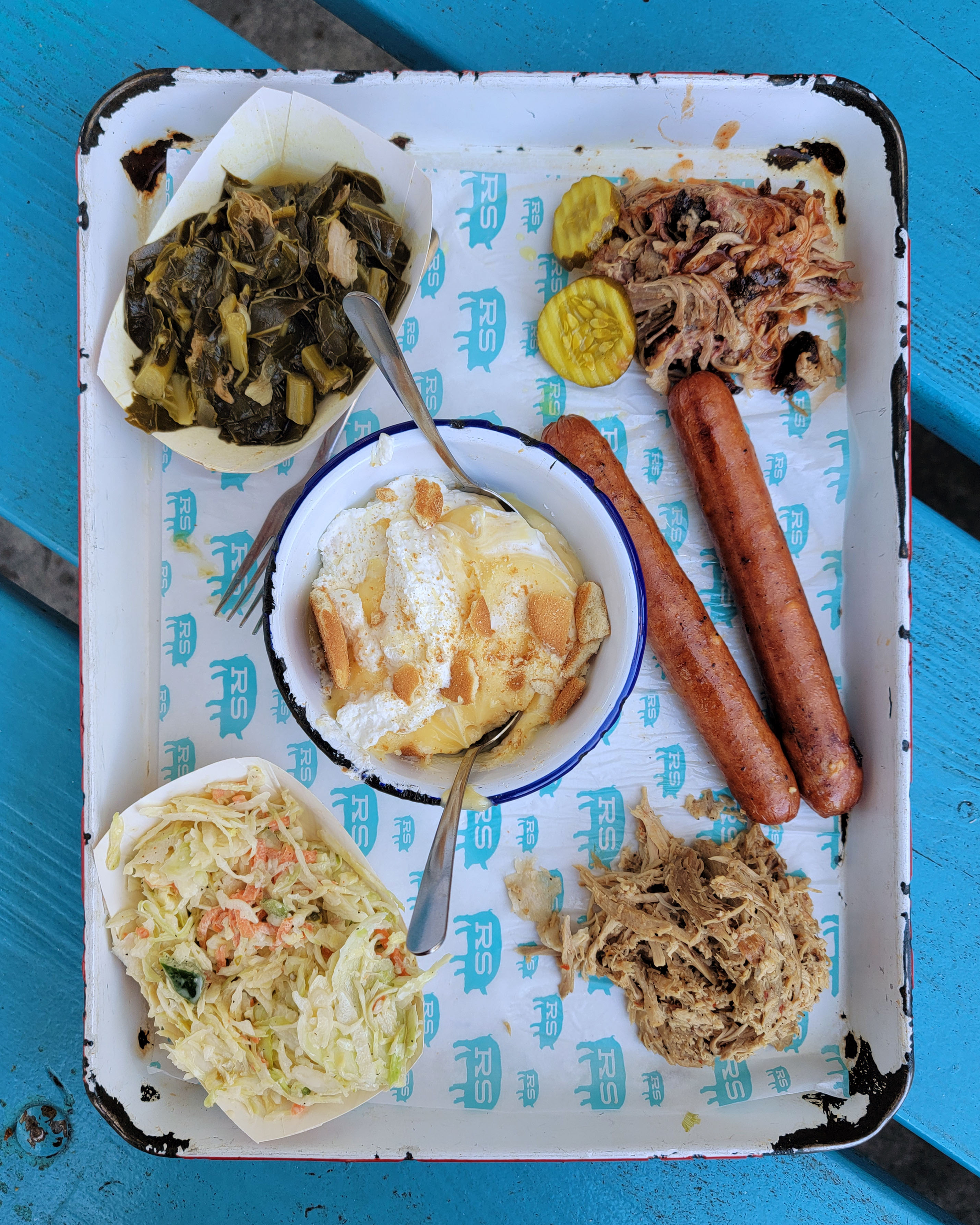 We tried the pulled pork, pork shoulder, pimento and cheese links, smoked wings, coleslaw, collard greens and banana pudding.