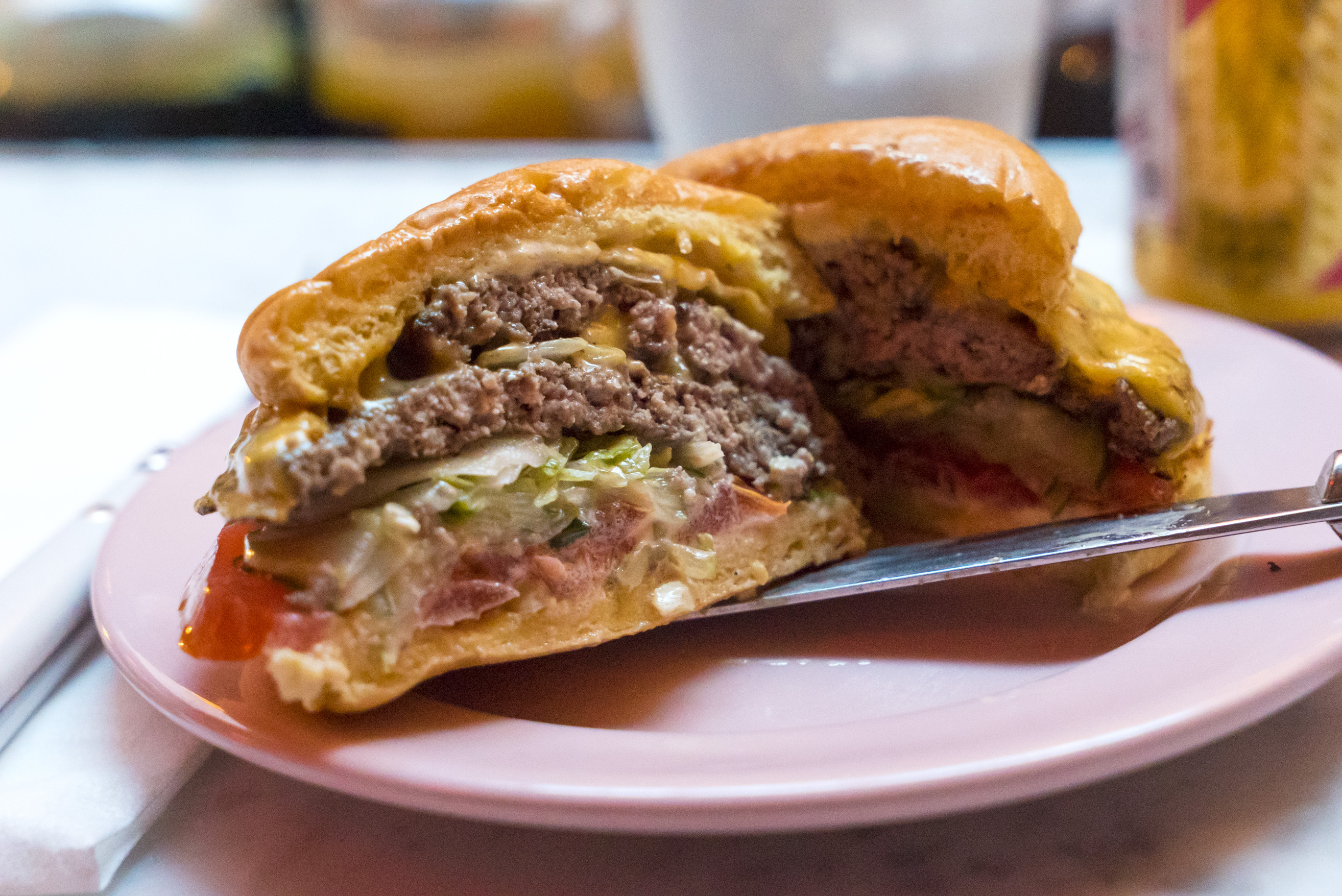I must say that the hype is well-placed. The burger is excellent, and easily slides into my top ten in the city. I didn’t quite taste the onion or special sauce, but that was only because they were generous with the cheese, which I like. The bun was fantastic – nice and simple, soft and strong. The lettuce gave it a good crunch, and the tomato supplied some juice, but without anything dripping all over the plate or my shirt. It was cooked a little bit too much, as you can see from the cut below, but not unacceptable: