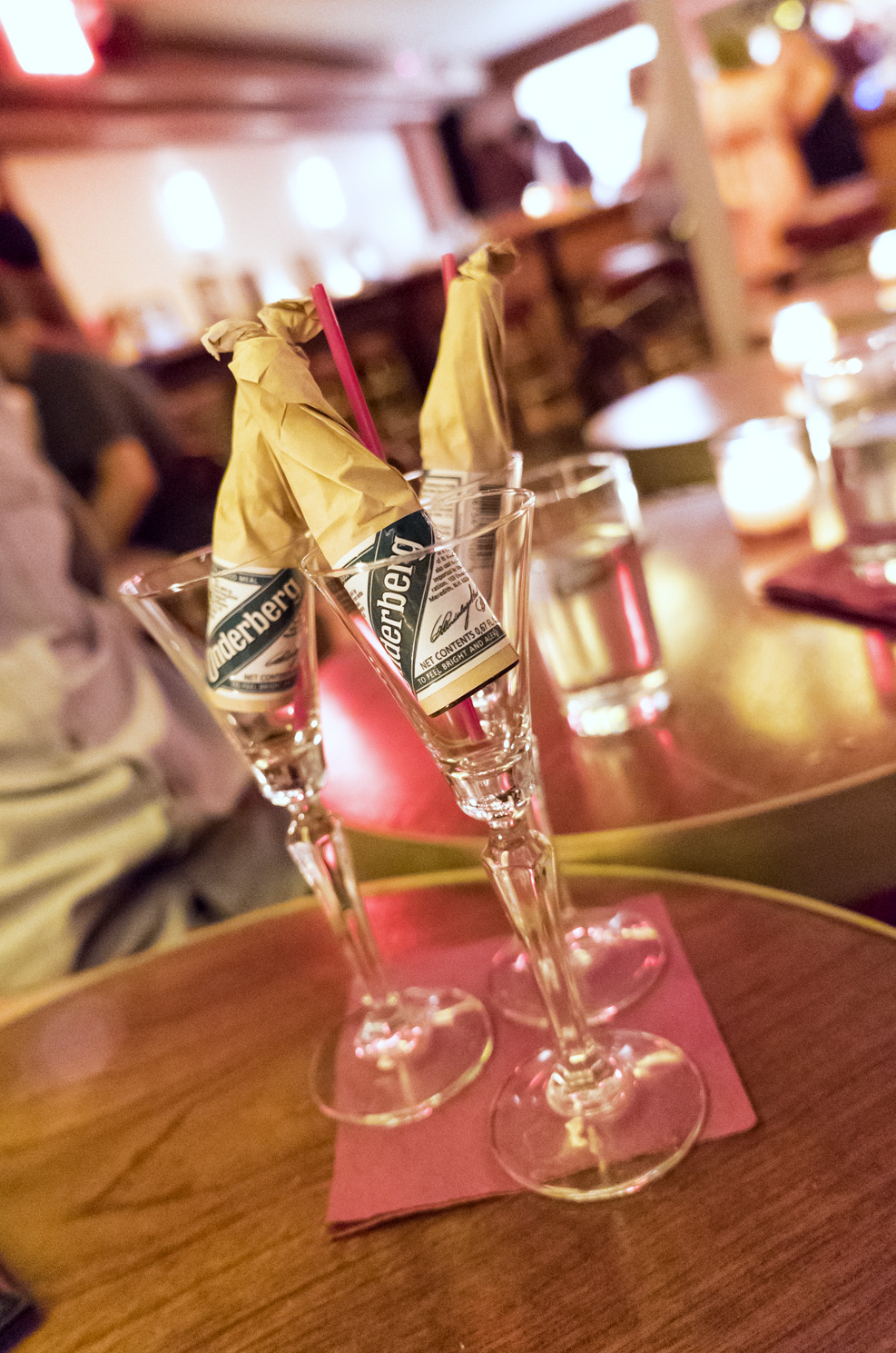 First let me start with the bar and drinks. The cocktails are a mix of exotic fruit flavors and old-fashioned, stiff, speakeasy drinks. Some of them are even served in tiki mugs, like this frozen slushee of the day, which was called Bad Medicine or Painkiller or something of that sort.