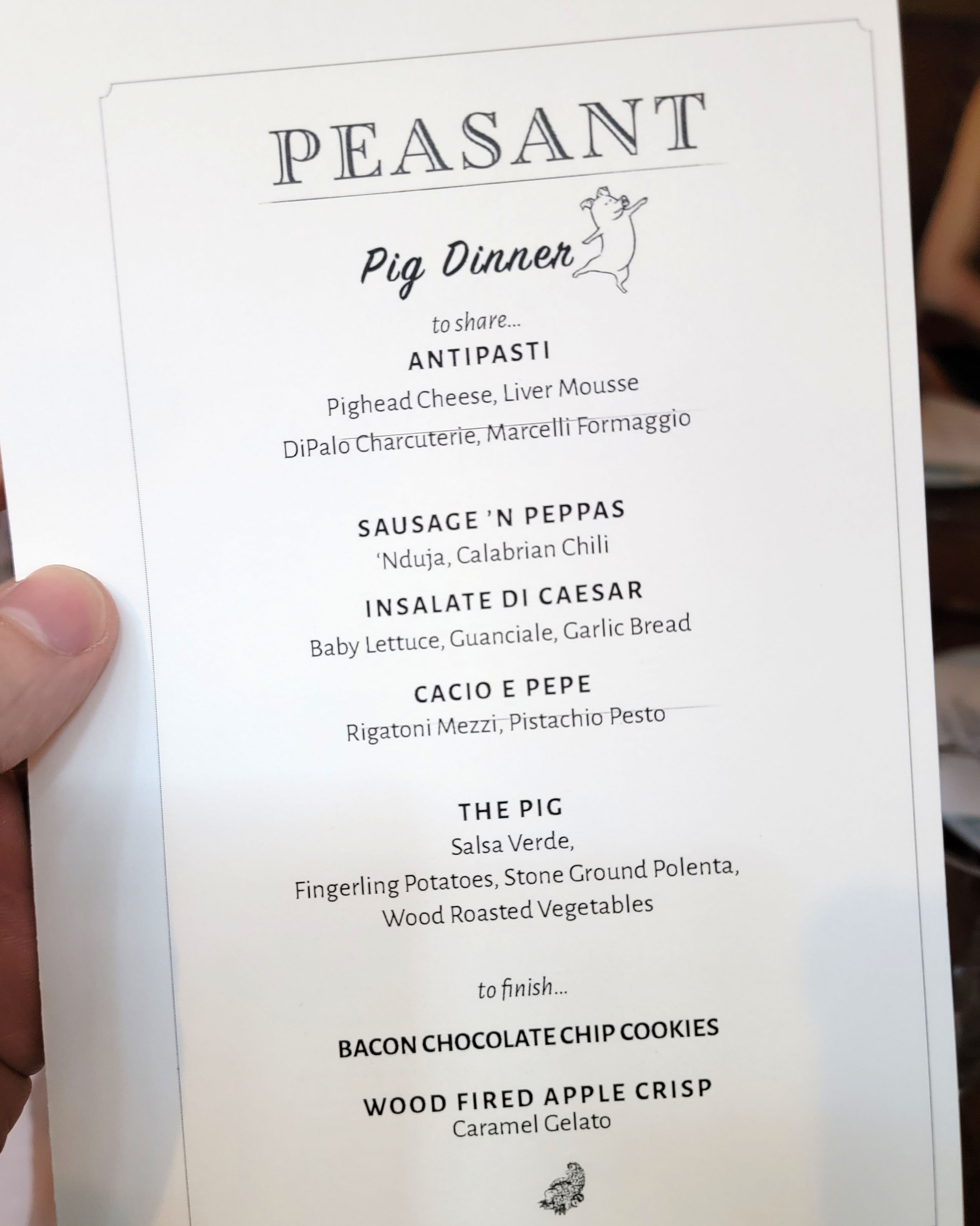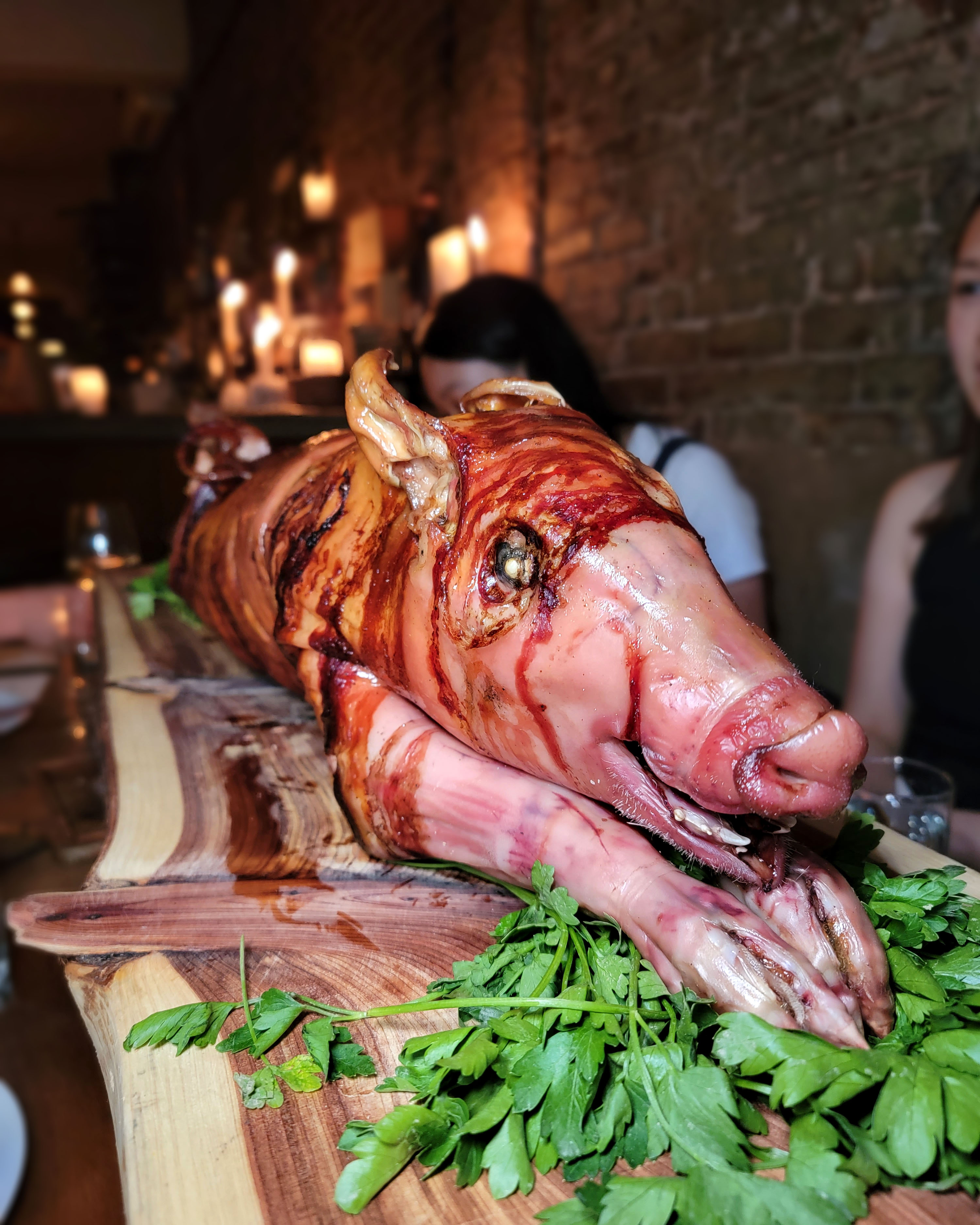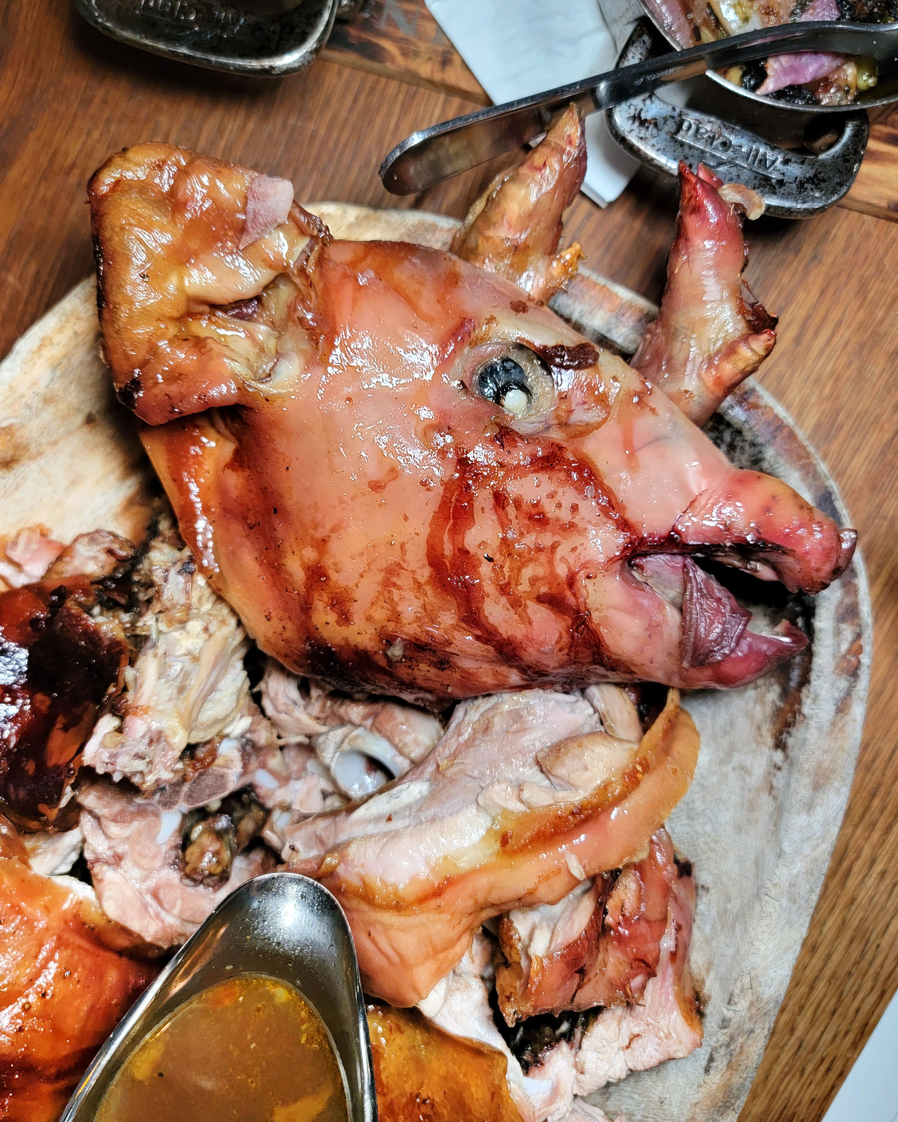 So let me get right down to business. The cocktails here are really nicely crafted. I tried two, the Timelessness (Hibiki, pomegranate molasses, sherry, yellow chartreuse and Laphroaig mist) and the Sitting Down For Dinner (duck fat-washed George Dickel, lemon, egg white and red wine). That second one is pictured here, along with my wife’s Smoke N Spice (Thai chili-infused Fidencio mezcal, pineapple, Aperol, Sriracha bitters and lime, served in a pineapple mug). Notice the shape of the duck created in the foam in mine: