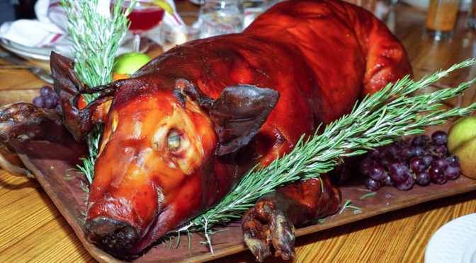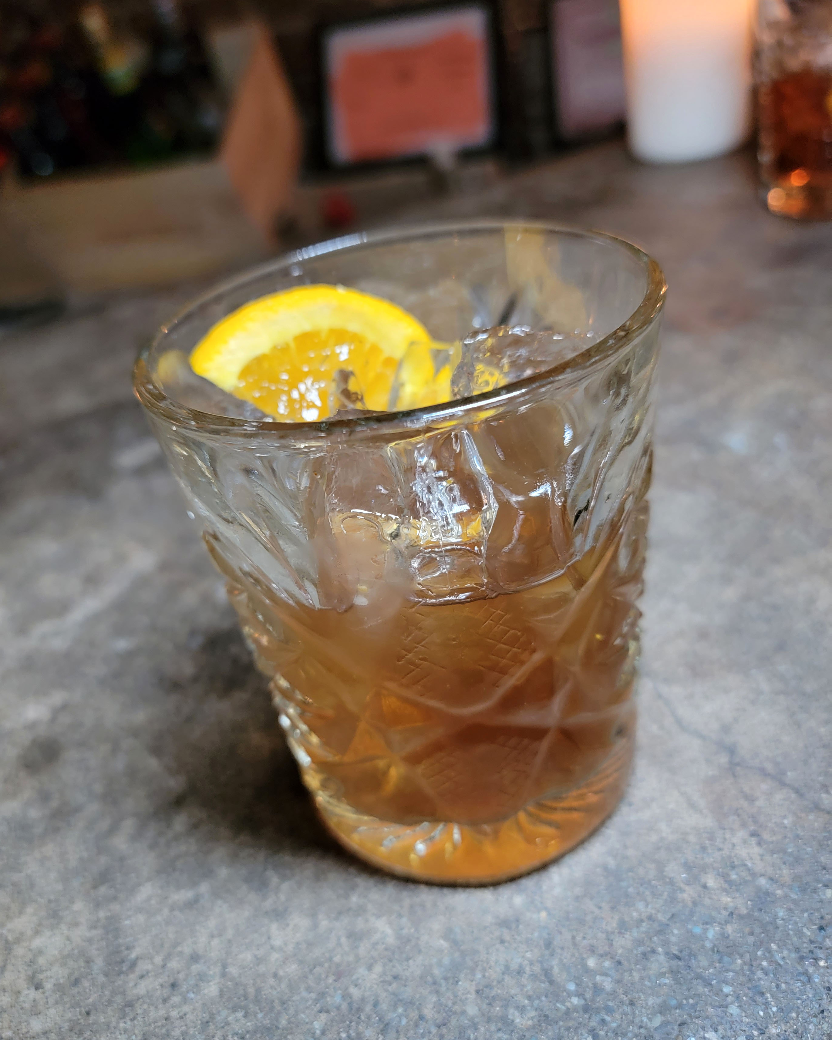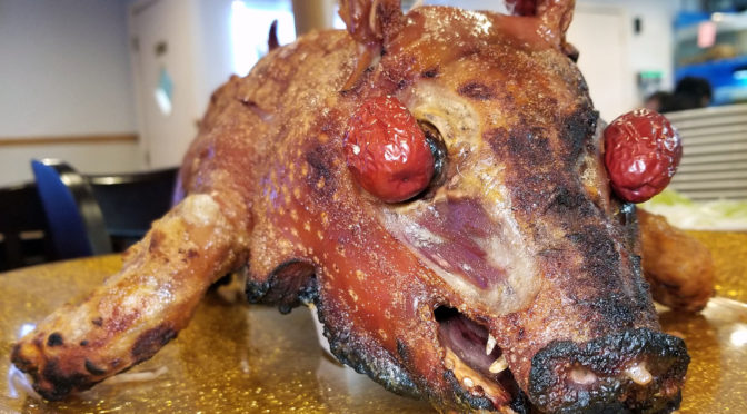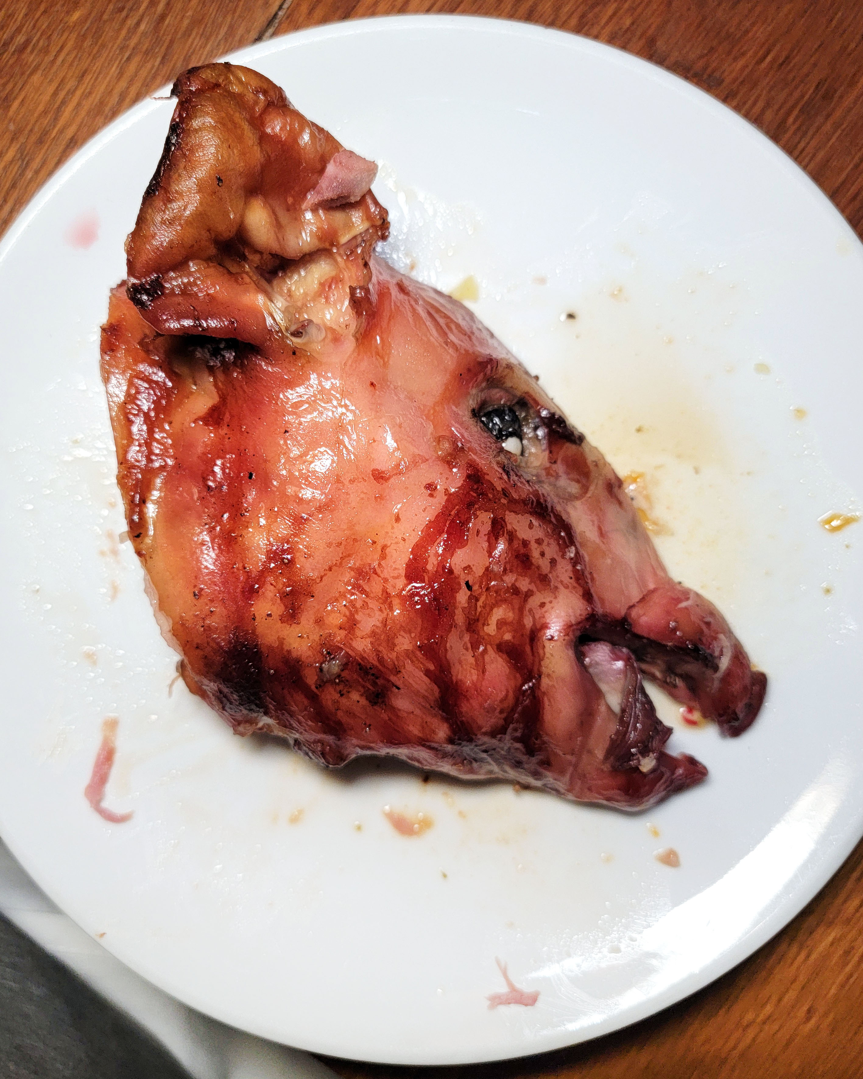 So let me get right down to business. The cocktails here are really nicely crafted. I tried two, the Timelessness (Hibiki, pomegranate molasses, sherry, yellow chartreuse and Laphroaig mist) and the Sitting Down For Dinner (duck fat-washed George Dickel, lemon, egg white and red wine). That second one is pictured here, along with my wife’s Smoke N Spice (Thai chili-infused Fidencio mezcal, pineapple, Aperol, Sriracha bitters and lime, served in a pineapple mug). Notice the shape of the duck created in the foam in mine:
