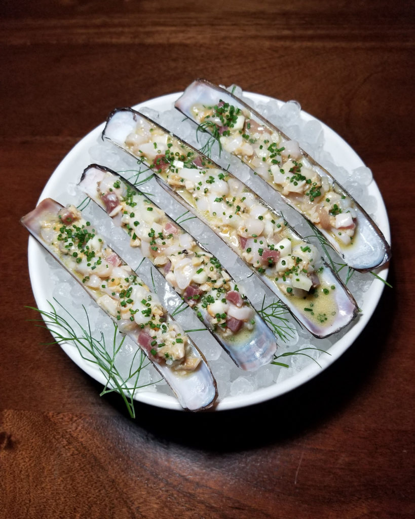These are treated very simply and grilled on a beautiful hot stone platter that’s been freshly slicked with beef fat. Add fresh flake salt, pepper and garlic ponzu to your liking after it cooks, on your plate.