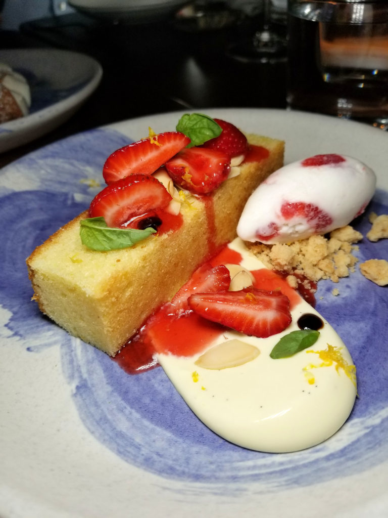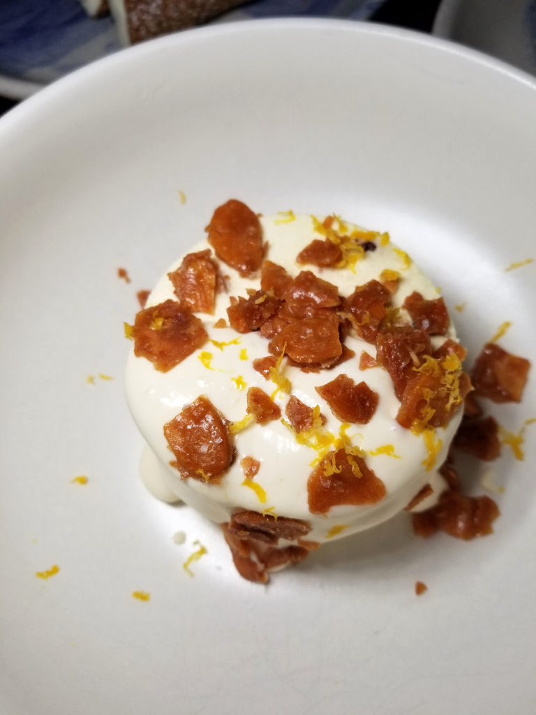 This apple cobbler crumble is a house favorite. Inside the pecan strudel there’s a toffee flavored blondie, baked apple and creme fraiche ice cream. Awesome.