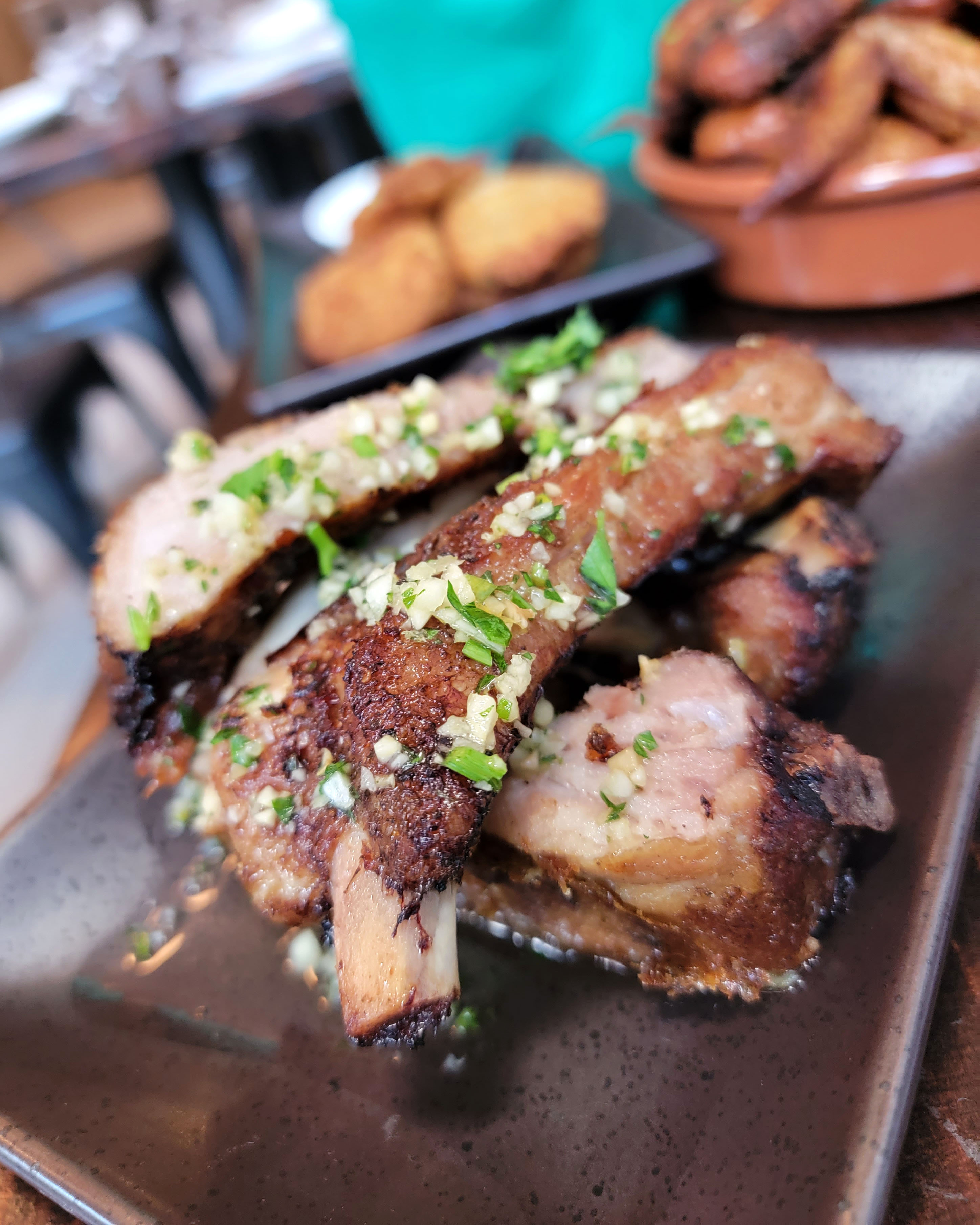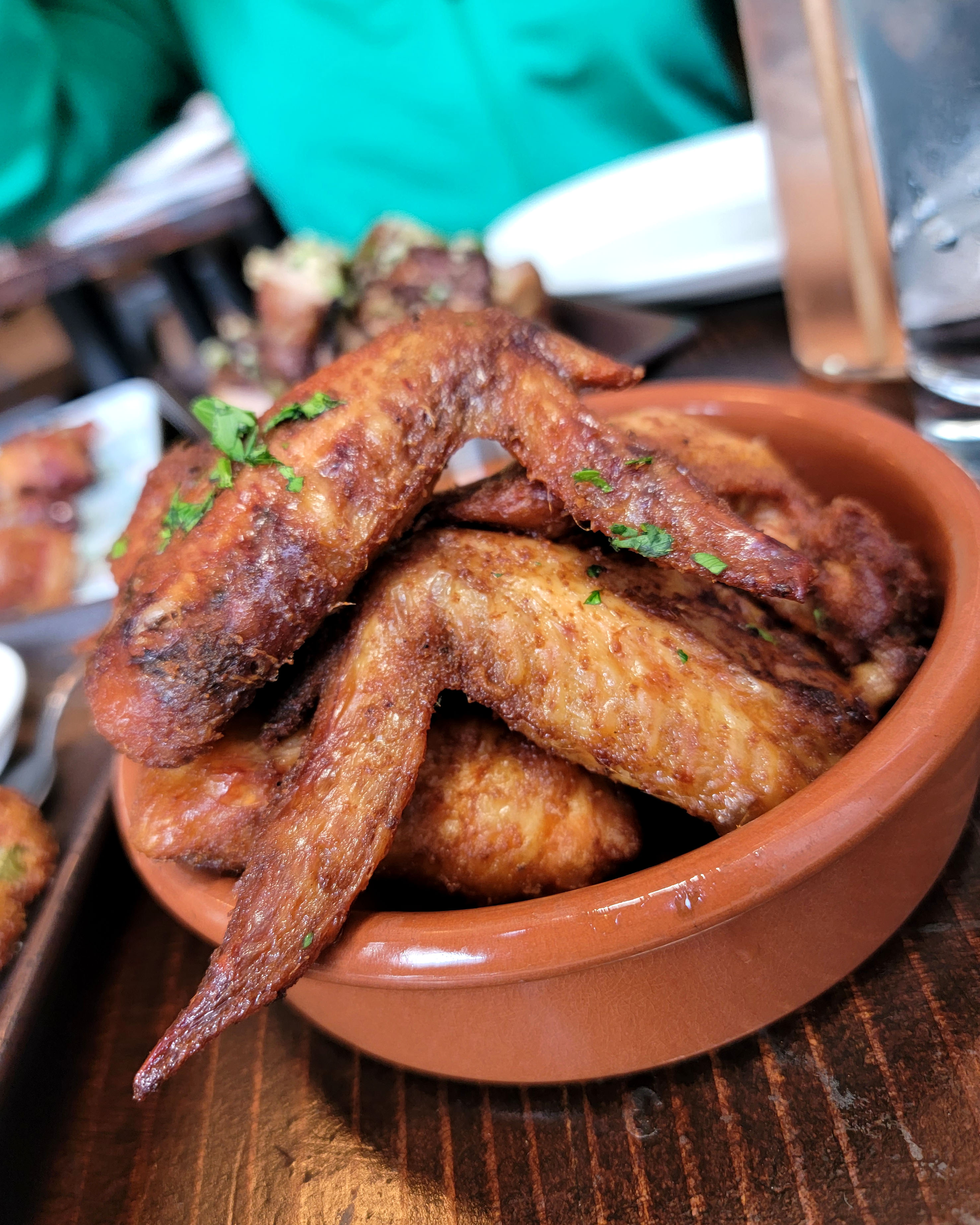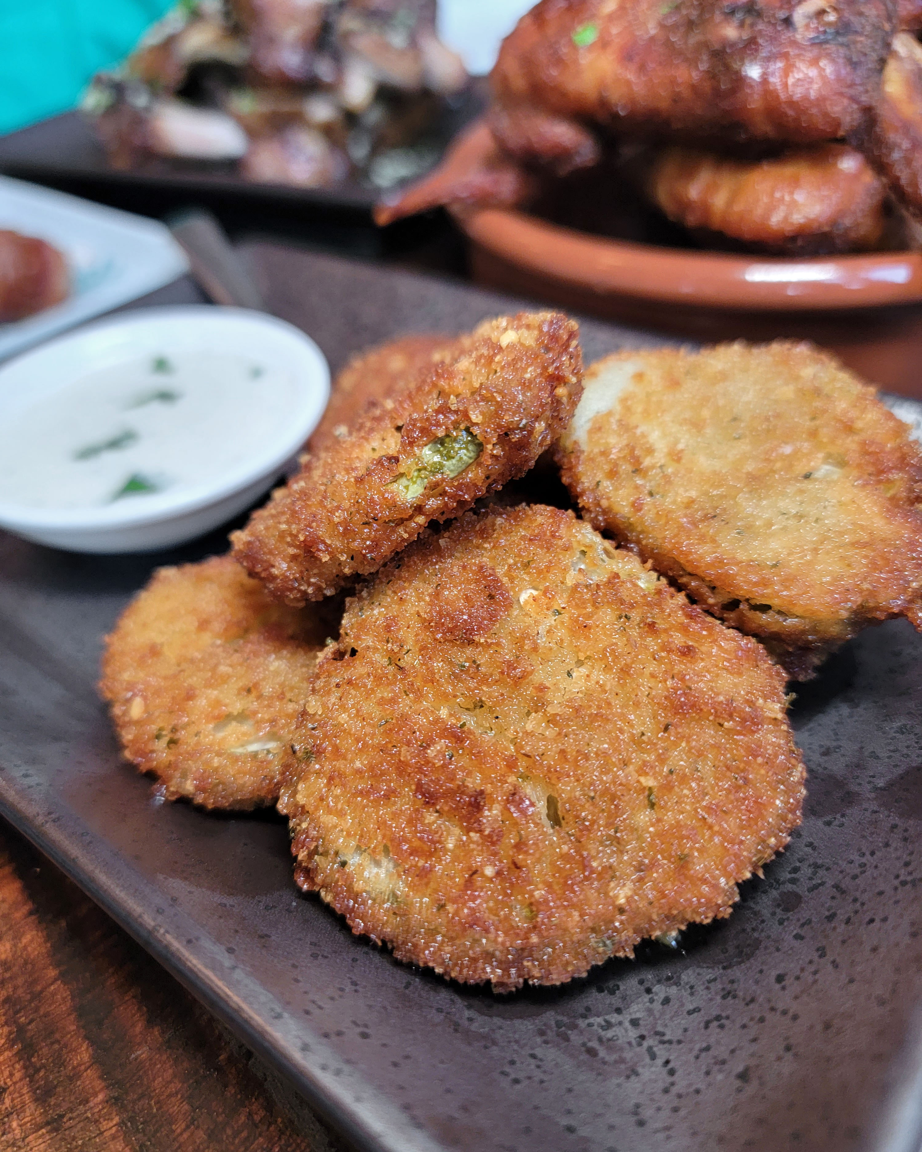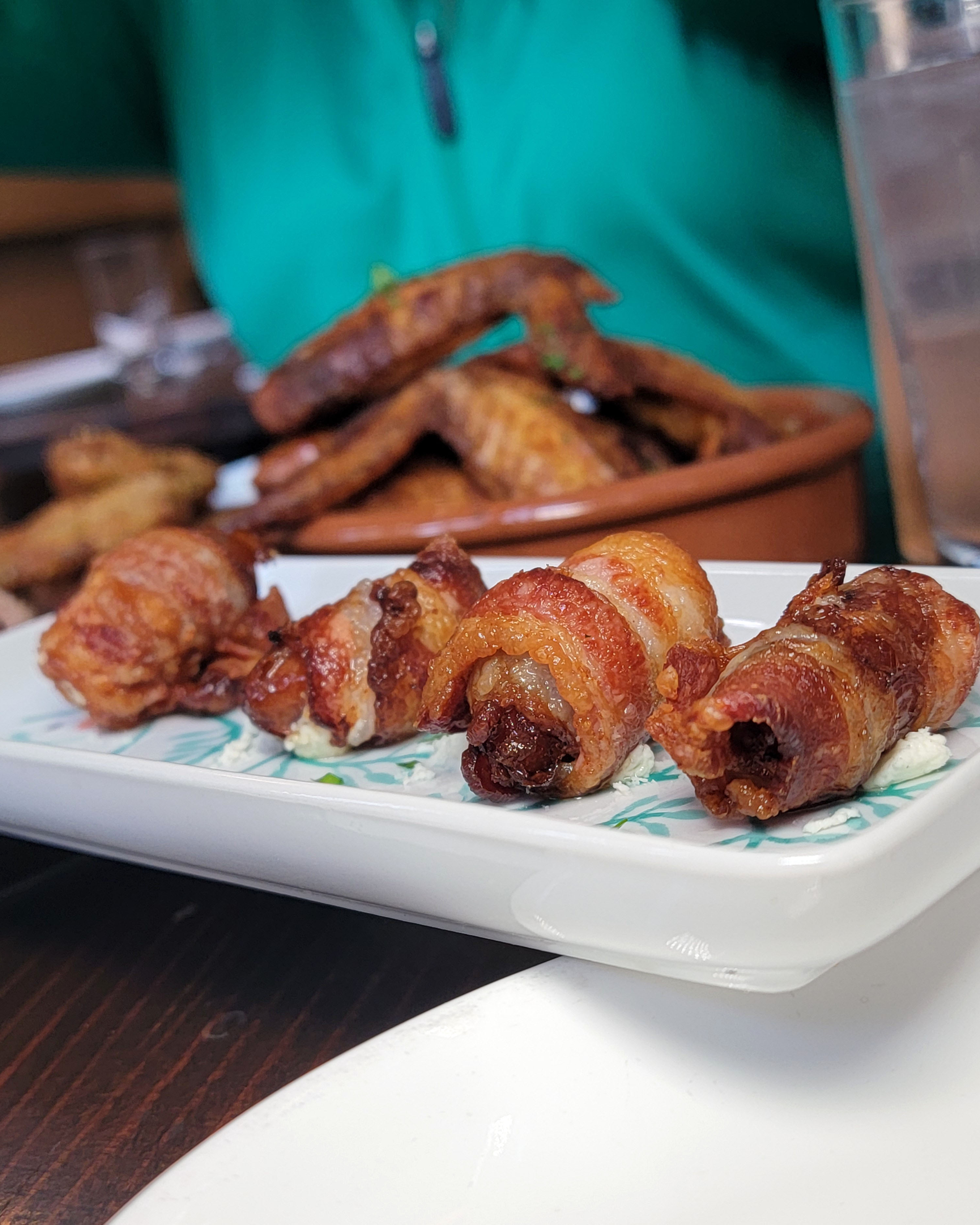 Fried pickles, wings, killer Tuscan style porchetta ribs, and bacon wrapped, goat cheese stuffed dates. All excellent!