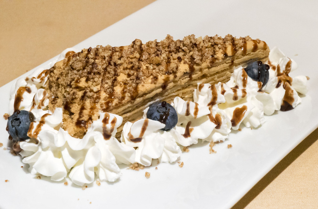 For our first dessert, we tried this crepe cake with chocolate mousse in the layers. Beautiful.
