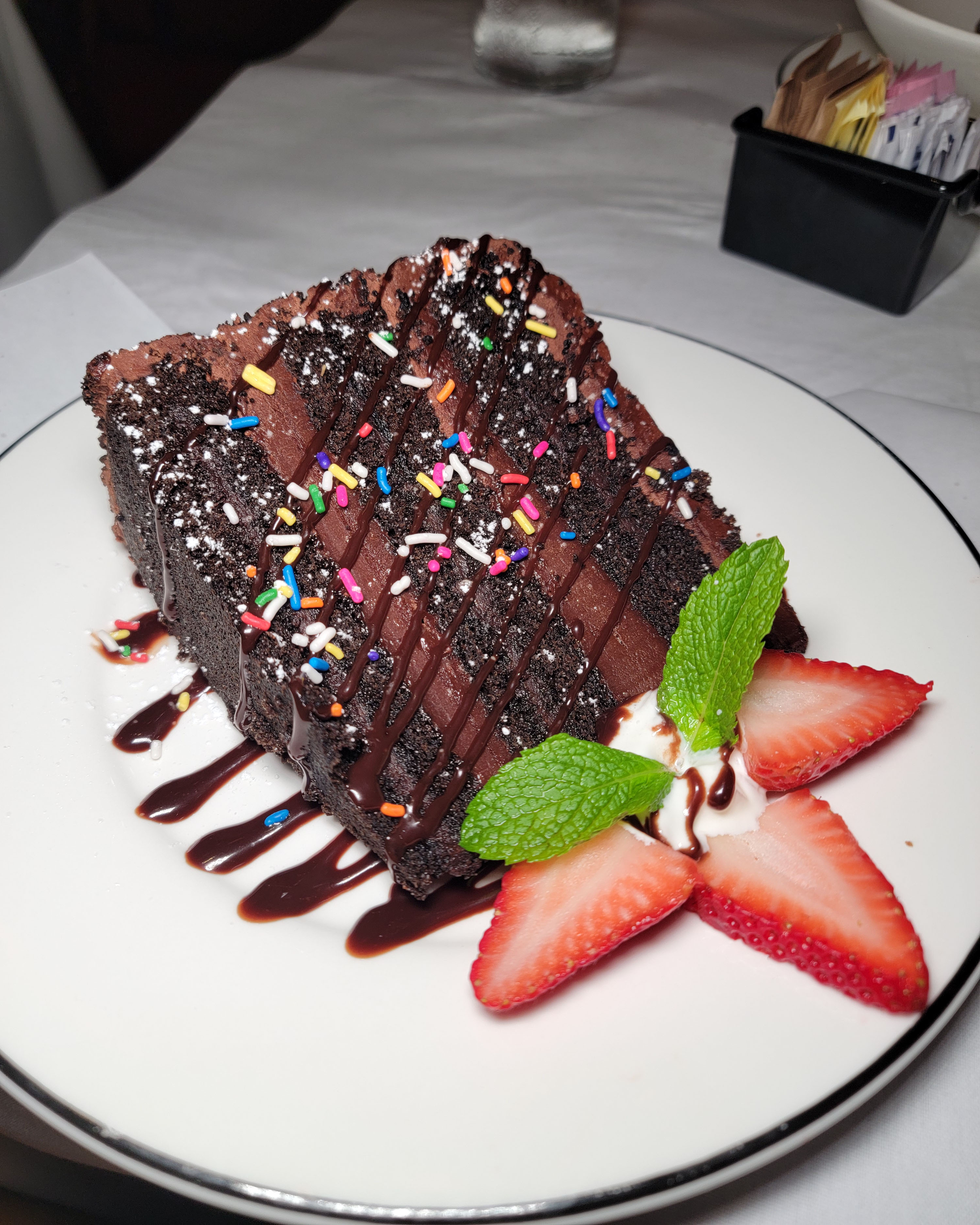 Ultra rich “double height” chocolate cake, served on it’s side.