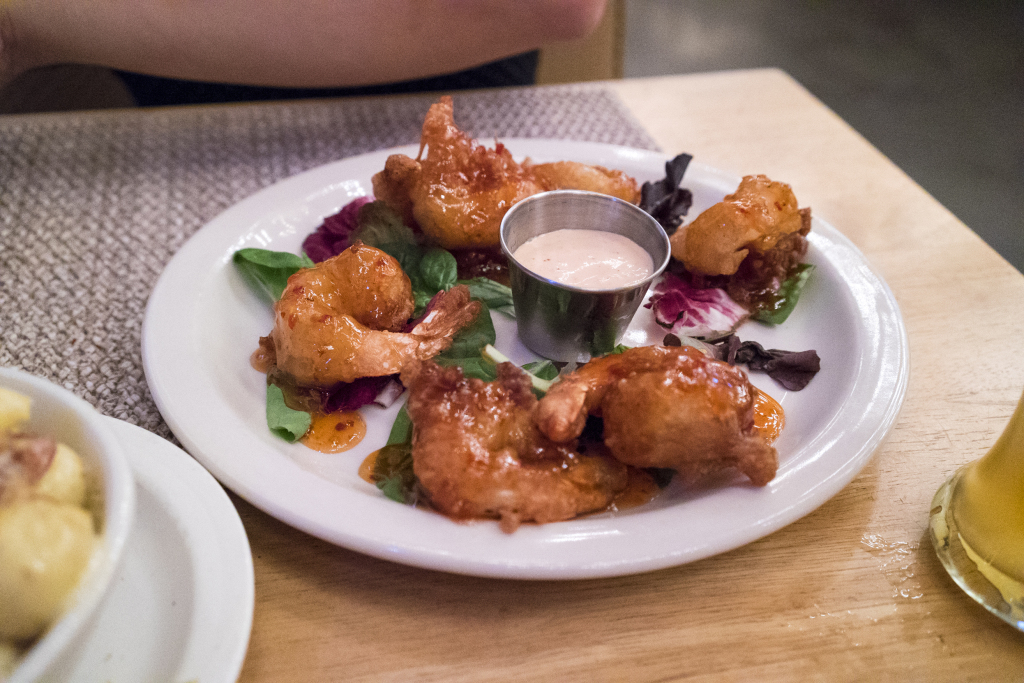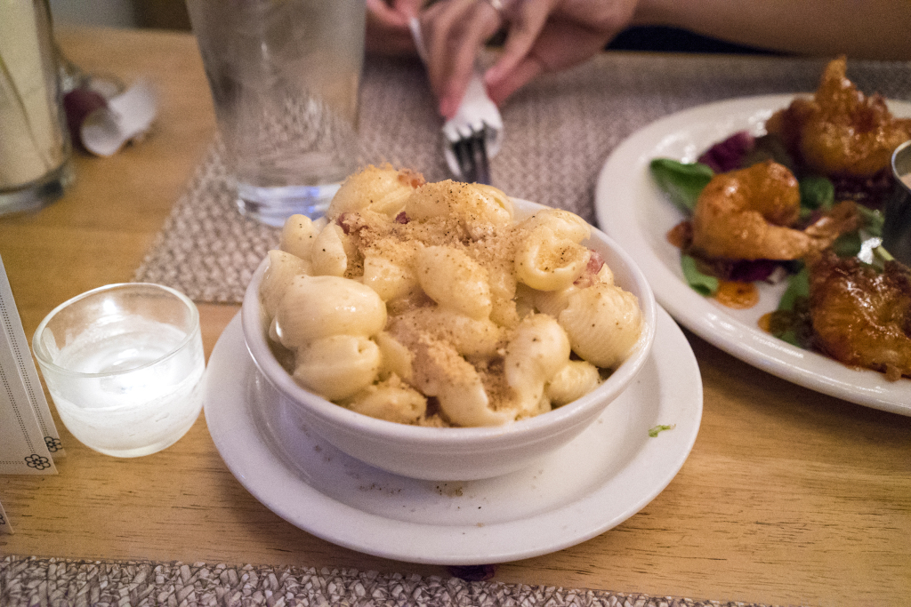 Next came the apps (we ordered an additional). Bacon and onion mac and cheese, followed by chili duck sauce shrimp. Both were tasty, though I didn’t think the $3 up charge for the bacon and onion in the mac was worth it. Also the shrimp came with a thousand island dipping sauce which didn’t mix well with the asian style sauce that was already on them. Other than that the batter and frying were perfect.