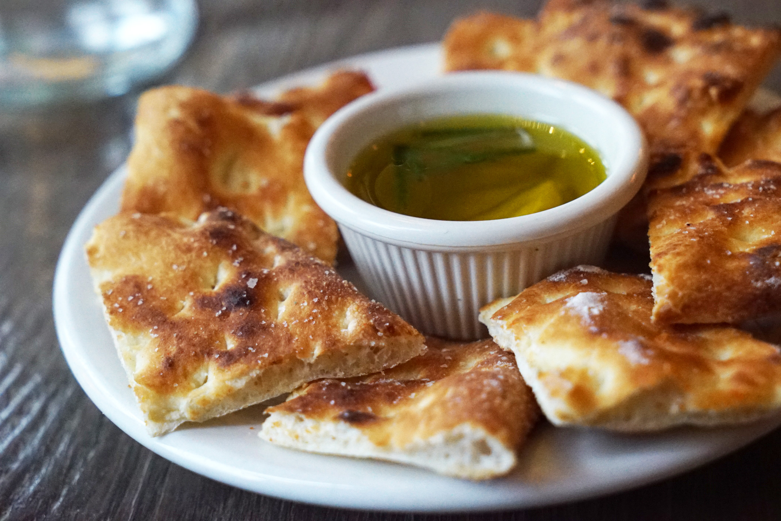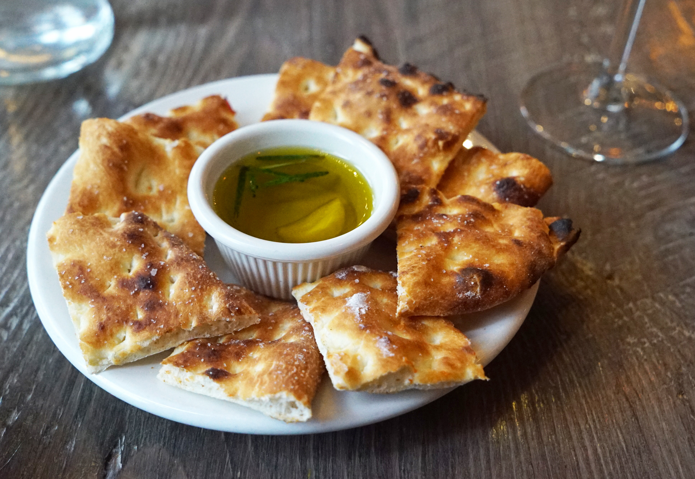 The first thing that our lovely waitress Valentina brought to us was this plate of warm flatbread foccacia, which was like a pizza crust that was ever-so-lightly salted. It was served with olive oil that had a garlic clove and a rosemary sprig in it. Light. Perfect. I could eat this shit all day.