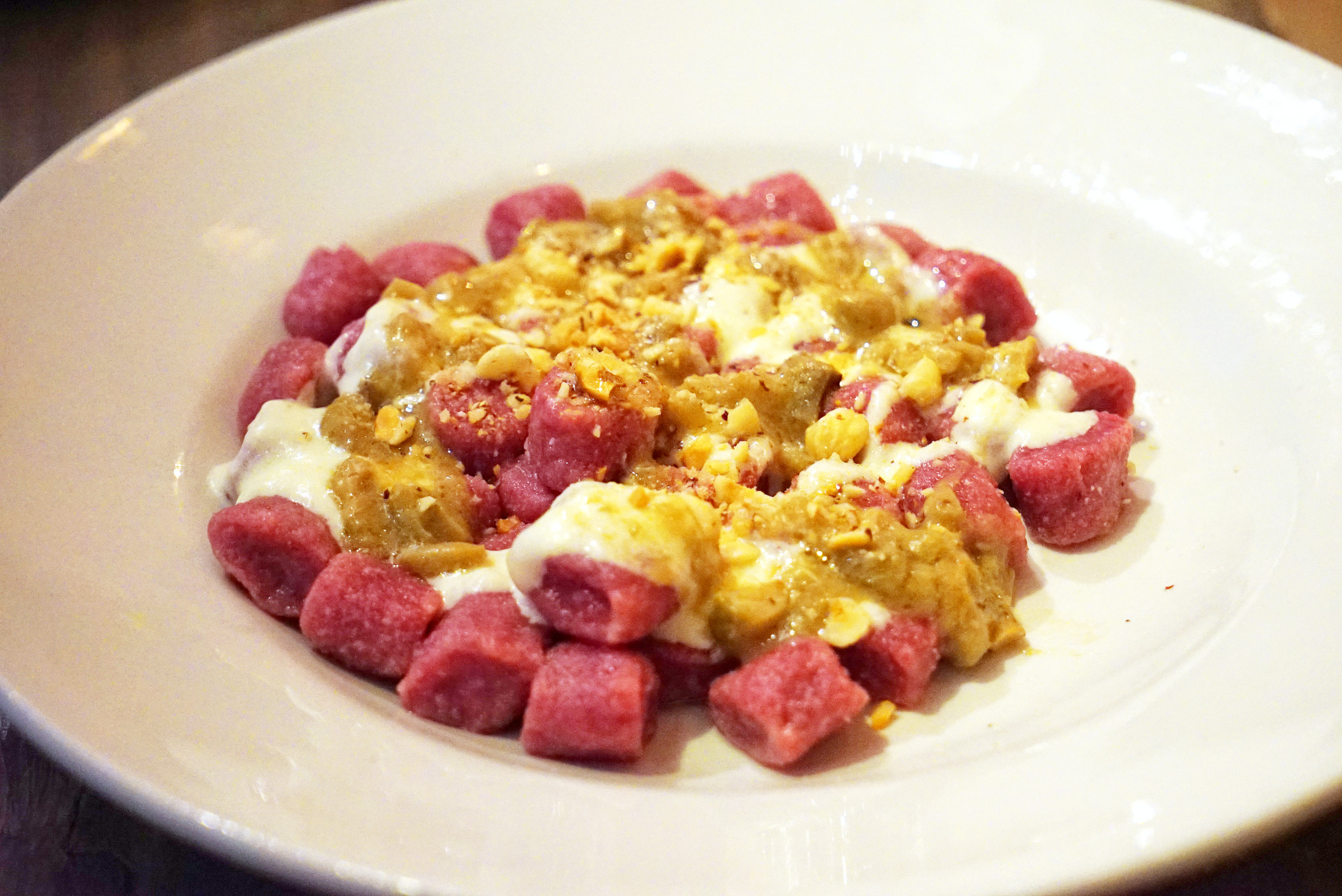 Then we got to try this really interesting gnocchi special. The purple color is from the beet and ricotta based pasta dough (all pasta is made fresh in house). The sauces on top were twofold: parmesan fondue porcini mushroom. The dish was then finished with some truffle oil and crushed hazelnuts. This was unique and very different, and stunningly gorgeous to see in person. They were like pasta bubble gum balls. I didn’t really taste any beet, but the flavor was really good.
