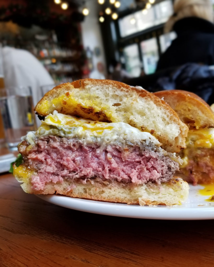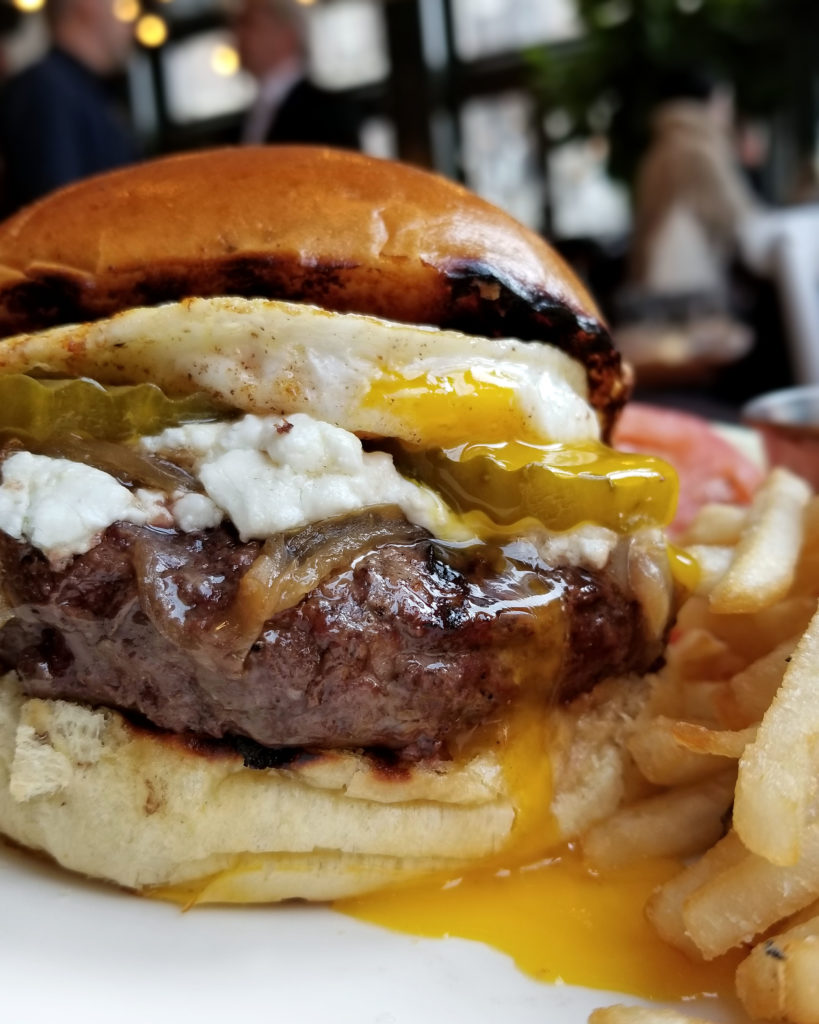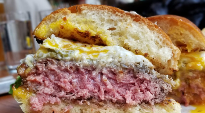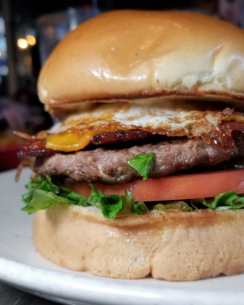 “The Hangover Burger” is a thick 8oz patty that’s topped with caramelized bourbon onions, blue cheese, pickles and a fried egg.