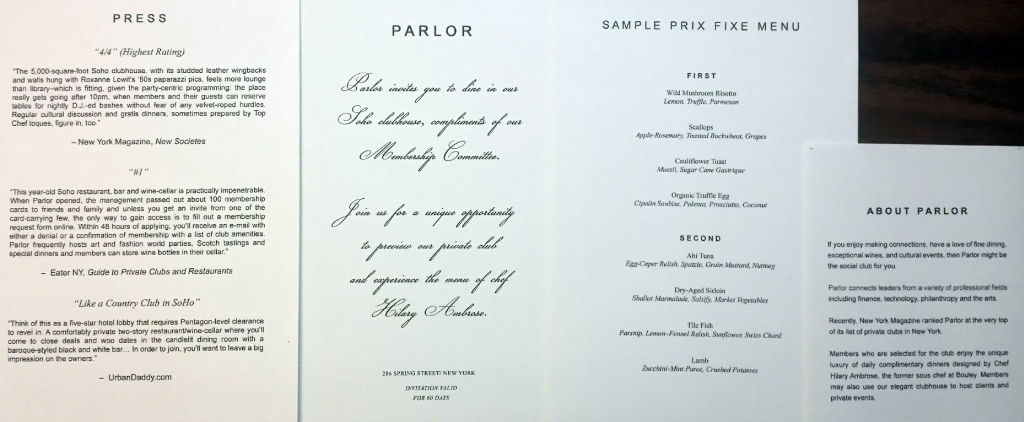 Parlor is an exclusive, private social club that has a unique focus on fine dining and creations from chef Hilary Ambrose, who was previously a sous chef at Bouley, according to the materials I was sent.