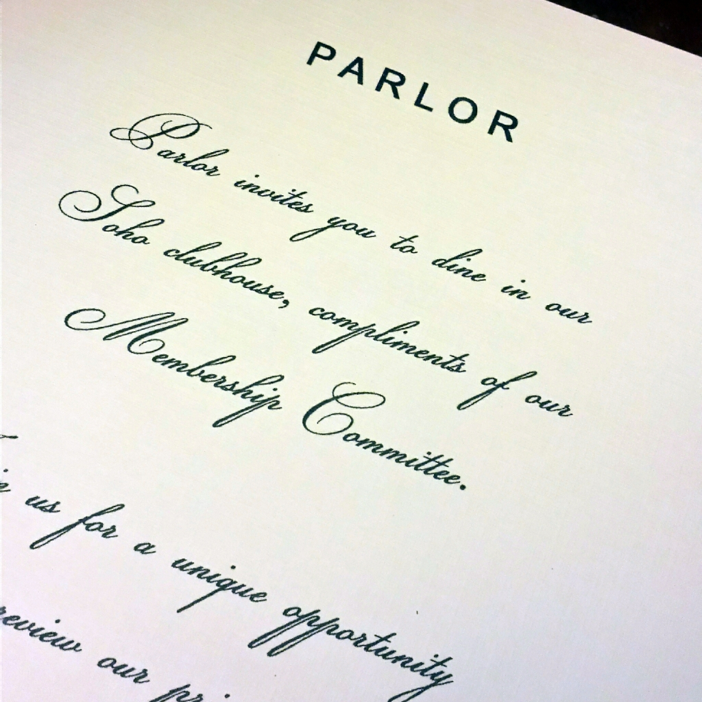 The invitation included some press, some info about the restaurant, a sample menu, and a secret link to make a reservation for their preview dinner. I had originally included said link here in this review, but the people at Parlor politely asked me to remove it. I’ll play ball, I guess. Read on…