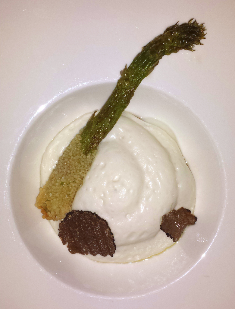 The appetizer, which was by far the best part of the meal, was a slow poached egg with shaved chicken and shaved truffle, then topped with a parmesan froth and a crispy asparagus spear that was crusted with rice cake crisps on the bottom. The egg was nicely cooked – not too snotty, great yolk consistency, good flavor from the truffle without being too heavy.
