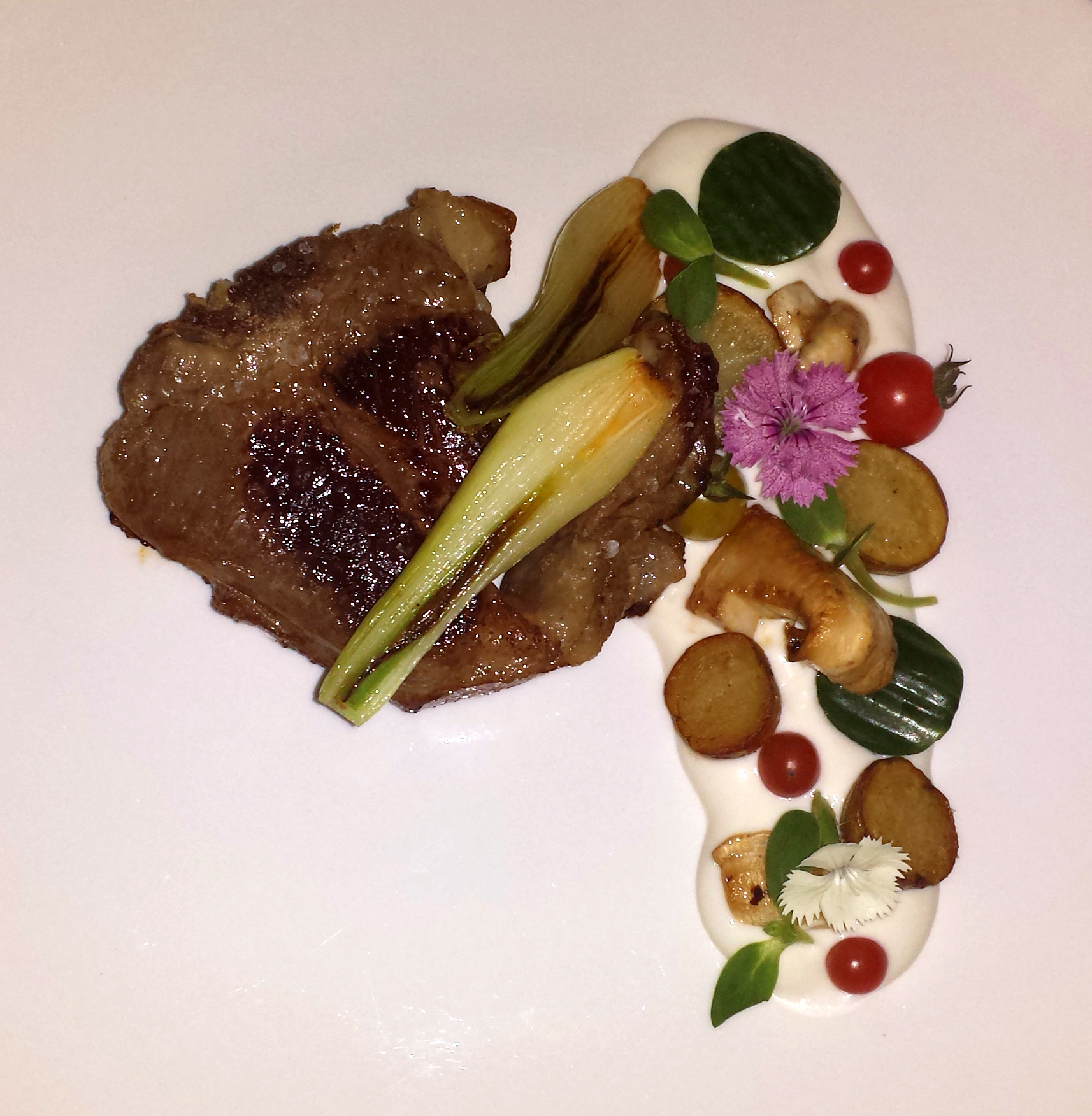 For entrees, we had lamb loin and aged strip steak (Snake River Farms). Both beautifully plated. The strip was 45-days aged, and 10oz.