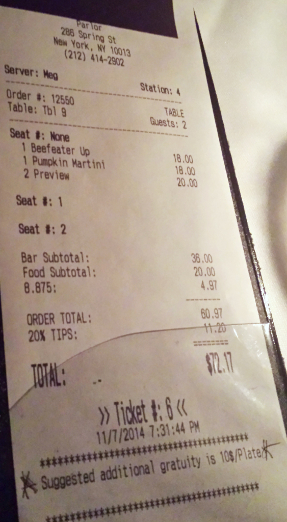 After browsing the website, and poking around at some reviews online, I found that membership is $1500 a year, plus a minimum $250 bar tab per quarter. Meals are “free” for up to four people, but not including a $10 per seat charge, plus the cost of drinks, tax and tip (which they automatically include in the bill at 20%, yet they still suggest that you tip an additional $10 per head on top of that). You can go as often as you want; you just need to make reservations ahead of time.
