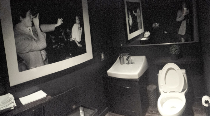 So I was thinking about the meal, the atmosphere, the space, etc., while pissing in the bathroom. They have these black and white photos of partying celebs and such on the walls. The one in the bathroom looked like JFK Jr. making bull horns while dancing. So we have a bull in the bathroom… next to the toilet… I took a pic. I call my work of art here “BULLSHIT.” A nice apropos closing to a sub-par, supra-priced and generally unfulfilling dining experience: