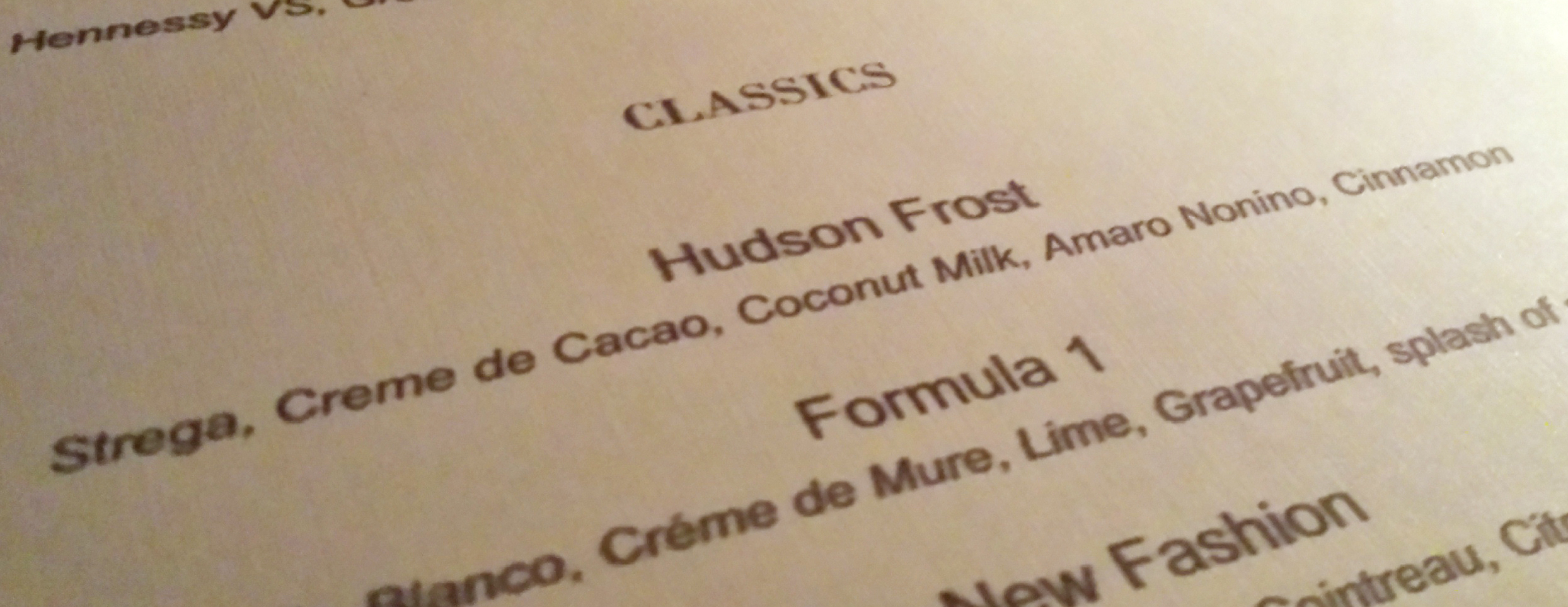 The best part of the experience here was this drink that my friend had at the bar: the Hudson Frost. Sort of like a white Russian who is on vacation in Hawaii and got drunk on an Italian digestif. Seriously though – great cocktail.