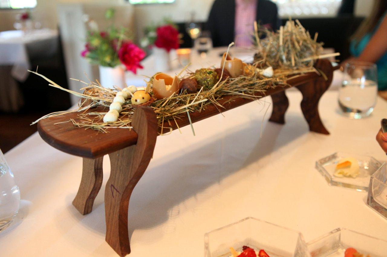 9) Ham and cheese sandwiches. These were made with speck and crisped cheese type crackers. Beautiful presentation, and one of the better bites of the meal. Again: give a man with hair on his chest a bit more that a single bite. I understand it is a multi-course feast, but feature the substantive dishes and downplay the “sides.” YEs – a veggie can be a side. But there were like 400 of them here to the handful of meat items. I get it. Veggies are awesome.