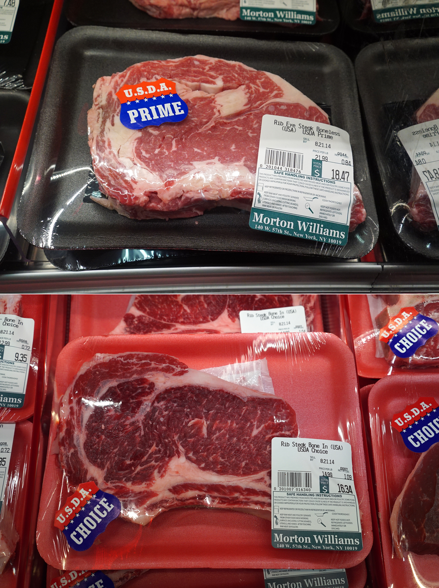 I am a big proponent of getting prime cuts when it makes sense. Generally speaking, the difference in quality is outstanding. However, you have to be careful. Don’t buy blind at the grocery store. Look at the photo below. Choice is $14.99/lb and prime is $21.99/lb. The up-charge is primarily for more and better marbling. But look with your own eyes. Does that boneless prime rib eye on top look any more marbled or better than the bone-in choice rib eye? In this case, I might buy the choice cut, even though the prime cut has a bigger Spinalis / fat cap.