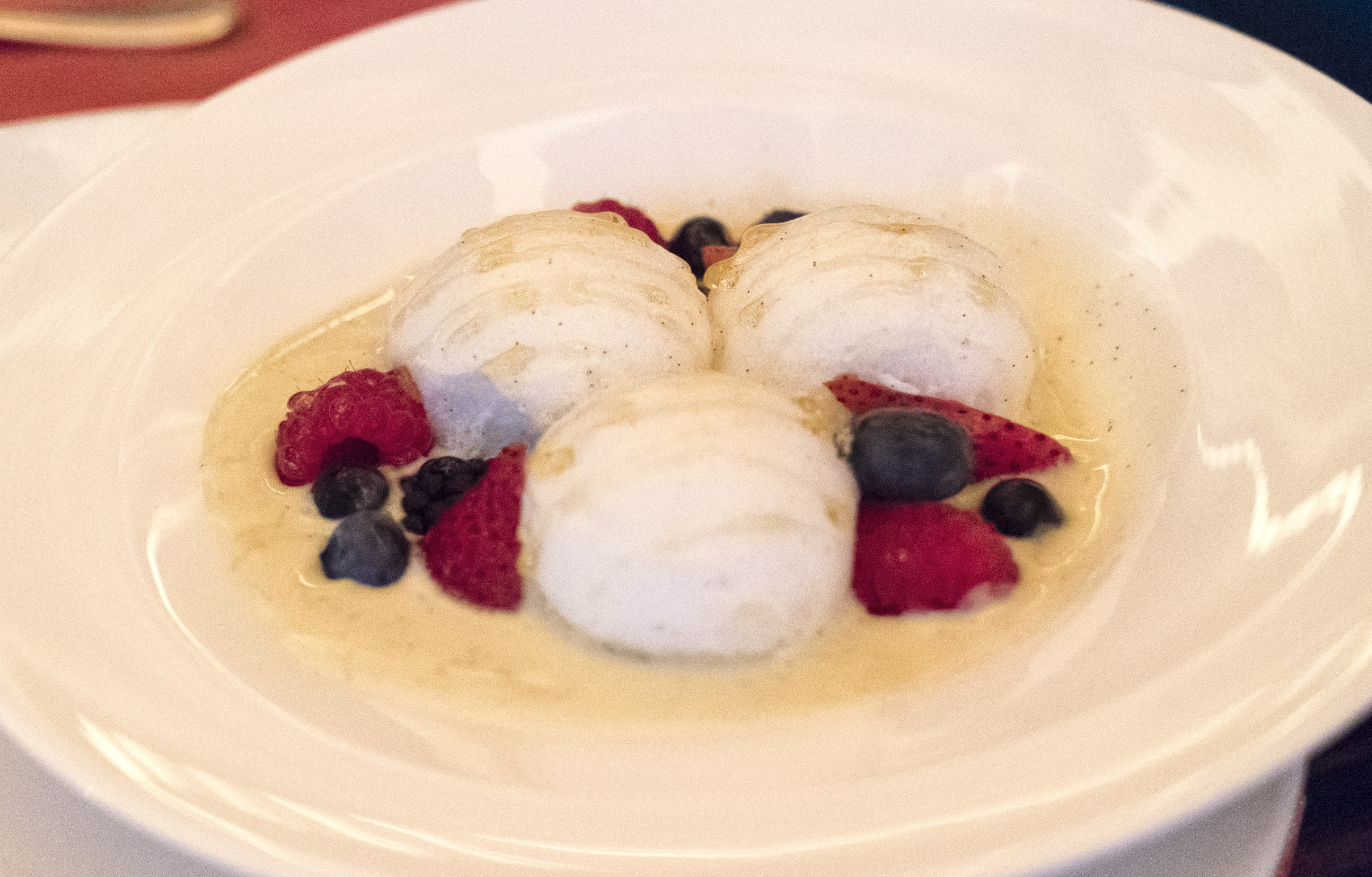 For dessert, we did the “floating island,” which was creme anglaise with merengue and fruit. Very nice and light. This was my favorite of the two, because each bite was dynamic.